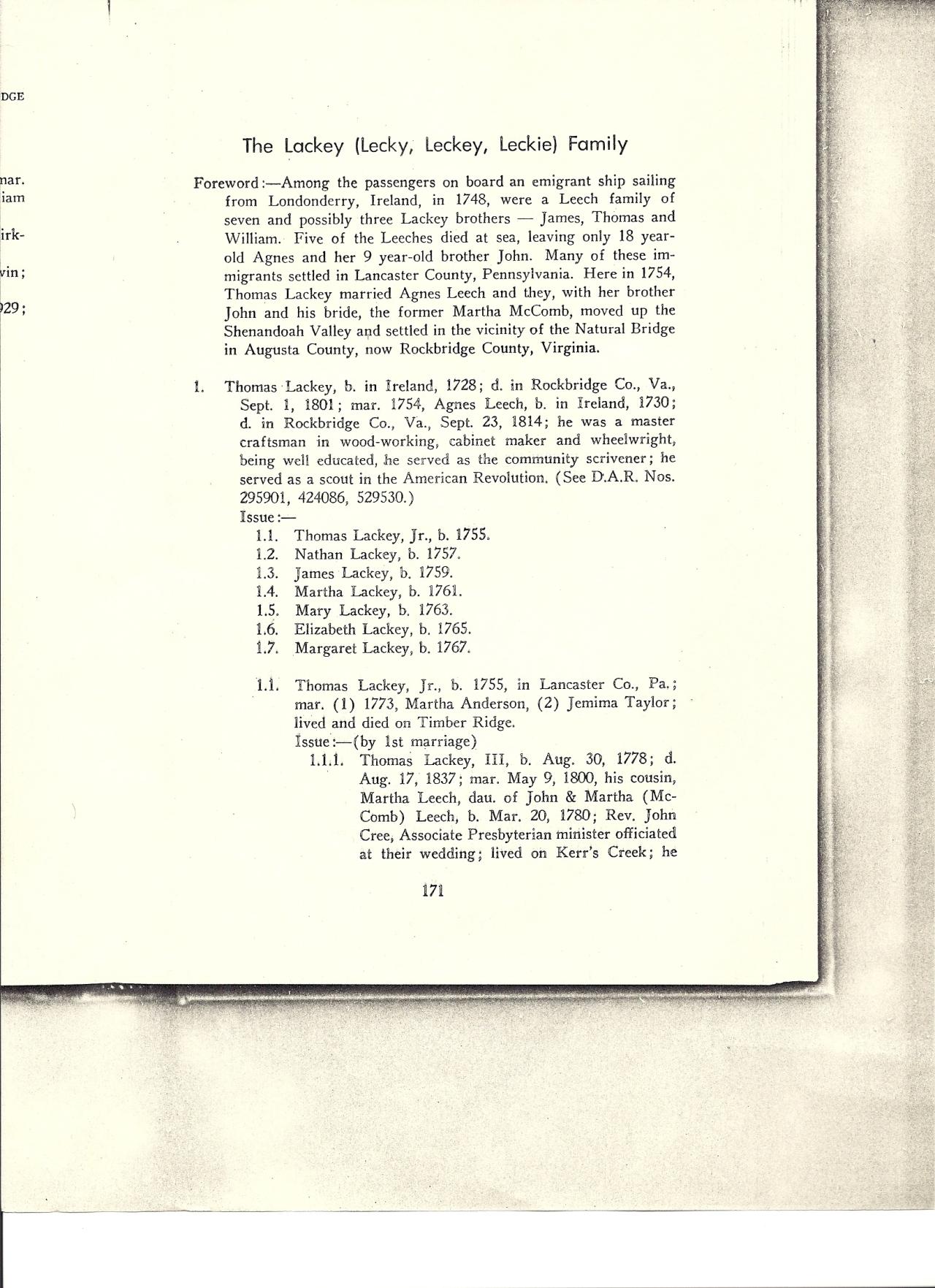 Among the passengers on board an immigrant ship sailing from Northern Ireland in 1748 were a Leech family of seven and Thomas Lackey. Five of the Leeches died at sea, leaving only 18 year old Agnes and her 9 year old brother John. Many of these immigrants settled in Lancaster, where Thomas Lackey married Agnes in 1754. They and Agnes' brother John and his wife Martha (McComb) moved to the Shenandoah Valley, in what is now Rockbridge Virginia.