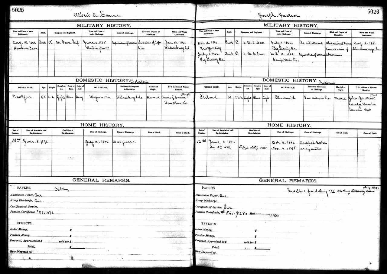 residenceLeavenworth, Leavenworth County, Kansas, USA ⇓ He was admitted to a U.S. National Home for Disabled Volunteer Soldiers. It mentions that he was working as a wagon maker, married possibly for a second time, as well as gives information on his military history. 1 Source ⇓ |