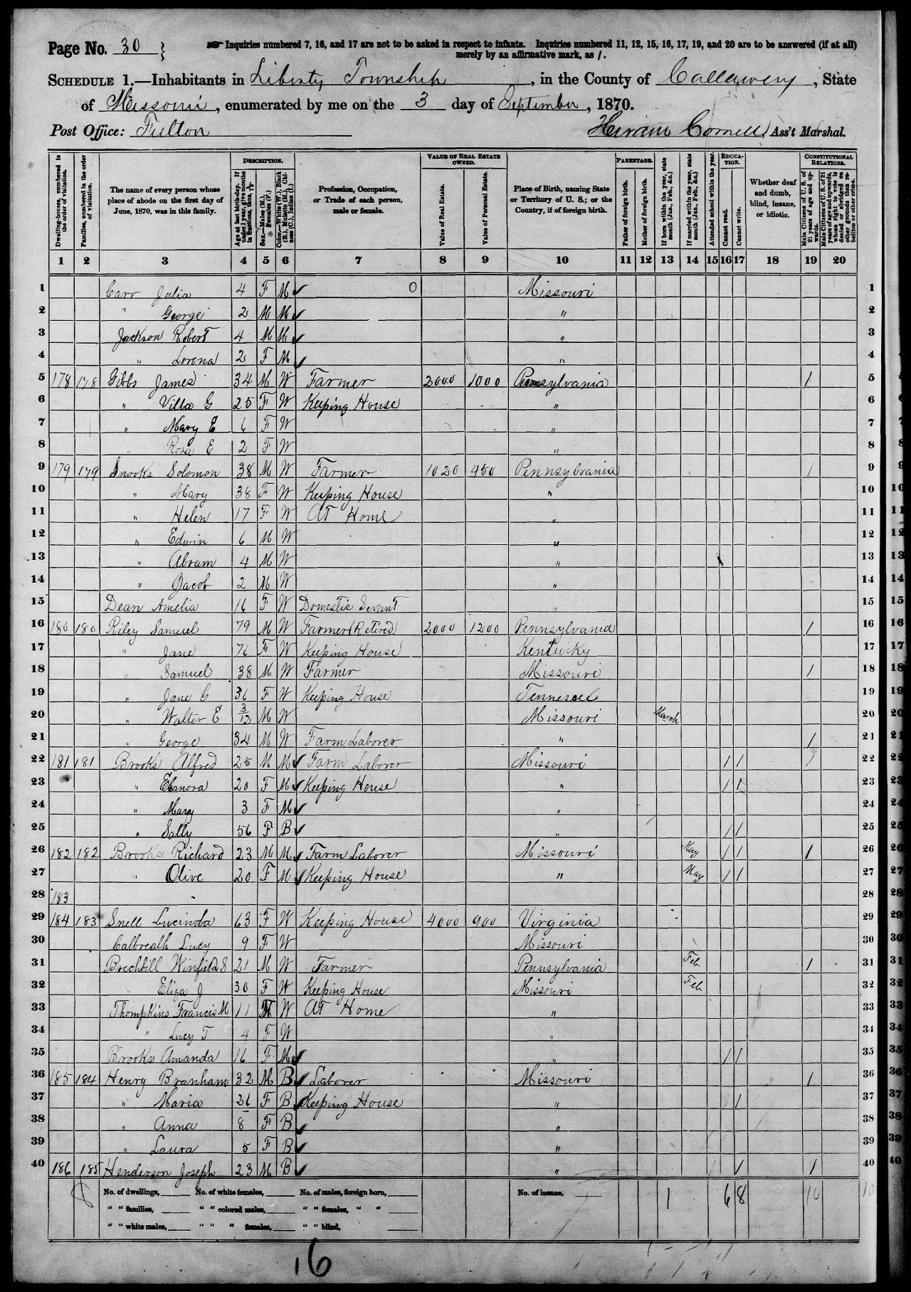 deathMissouri, USA ⇓ In 1870 his daughter Frances is living with another relative. It appears she might have had a younger sister Lucy. They are staying with a Lucinda Snell, aged 63, born in Virginia, some Brechbills, a 9 year old girl named Lucy Calbreath, and a 16 year old girl named Amanda Brooks. Neither of the parents I can find. Later, in 1880, they are listed as the daughters of Brechvill (or Brechbill.) 2 Sources ⇓ |