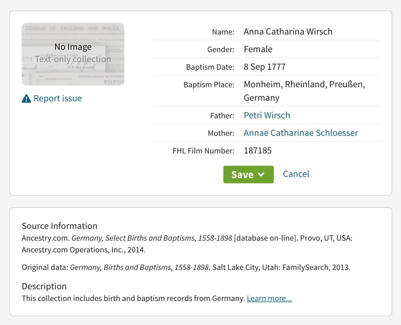 birth of childAnna Catharina Schumacher Monheim, Rheinland, Preußen, Germany ⇓ She was christened that day Monheim. 1 Source ⇓ |