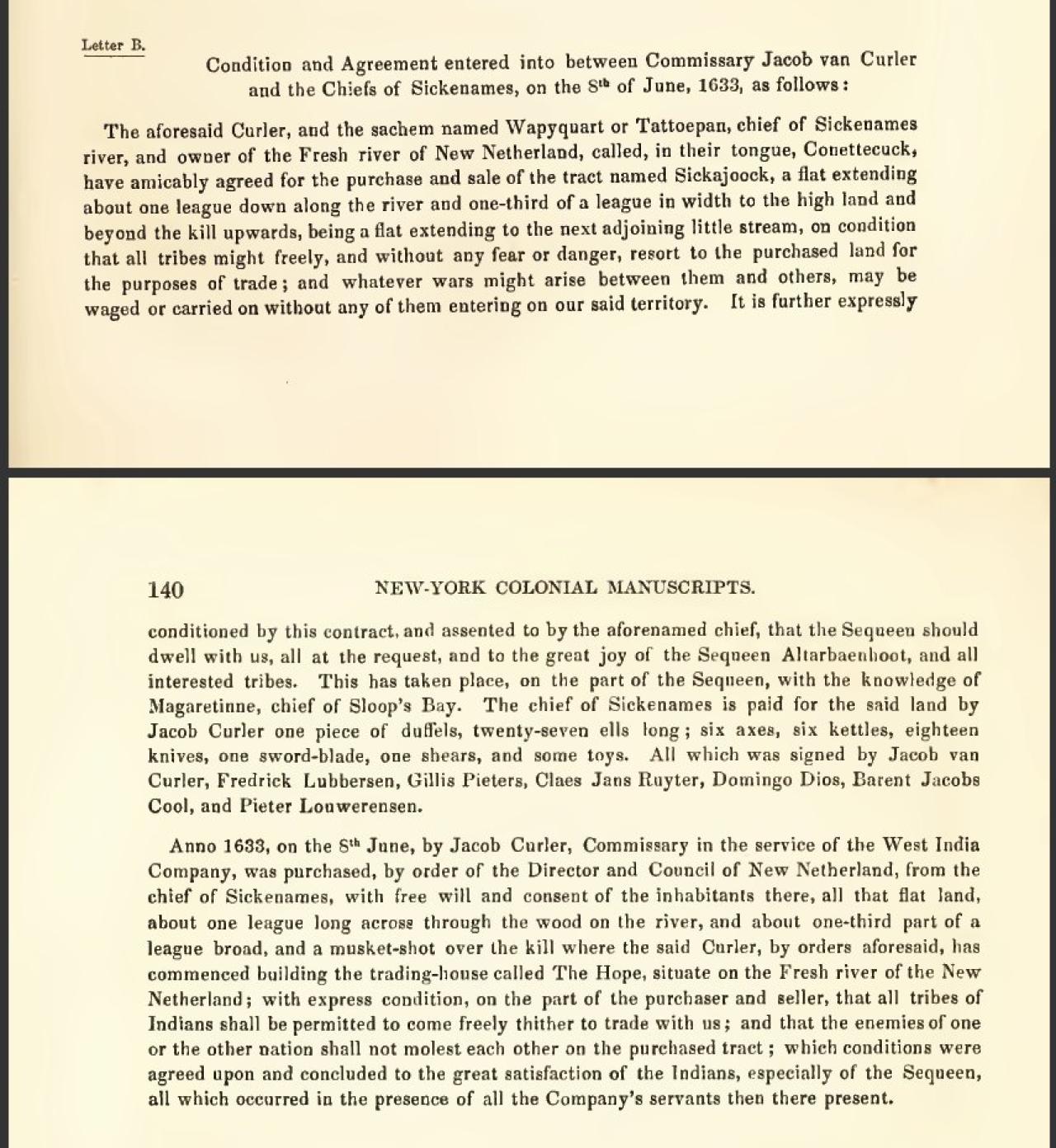 treatyNew Amsterdam, New York, USA ⇓ Barent Jacobsen Cool sailed to New Amsterdam in the services of the Dutch West-India Company, on one of his sailings possibly from Amsterdam as a sailor in late 1632 on the ship Soutberg, which arrived in April 1633 with 140 soldiers. At this time, New Amsterdam, or New York City, only had a population of around 400-500. On June 8, he and six others signed a treaty with the Sickename Indians to purchase land on the Connecticut River. The cost was recorded as 27 rolls of cloth, 6 axes, 6 kettles, 18 knives, and other articles. Barent's group also built a trading house called "The House of Good Hope" or "Huys de Hoop" and fortified it with several cannons. This was done to halt English exploration of the land. 2 Sources ⇓ |
