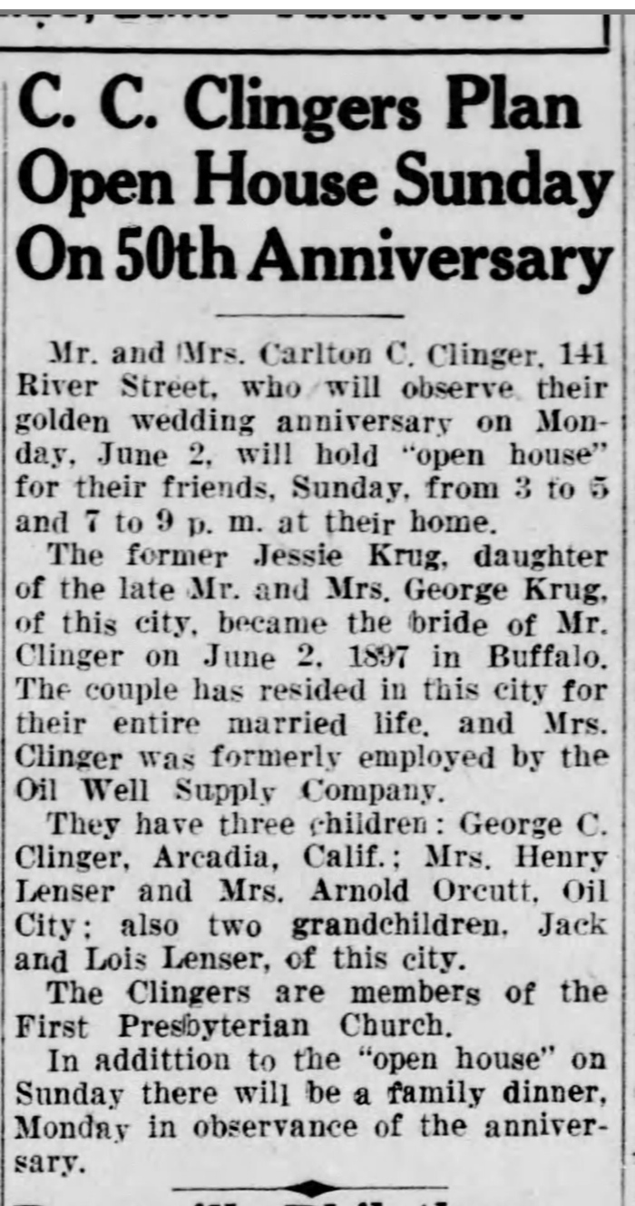 anniversaryOil City, Venango, Pennsylvania, USA ⇓ They were living on 141 River Street at the time, and celebrated their 50th wedding anniversary by having an open house from 3-5 and 7-9 pm for their friends, and a family dinner the next day. |