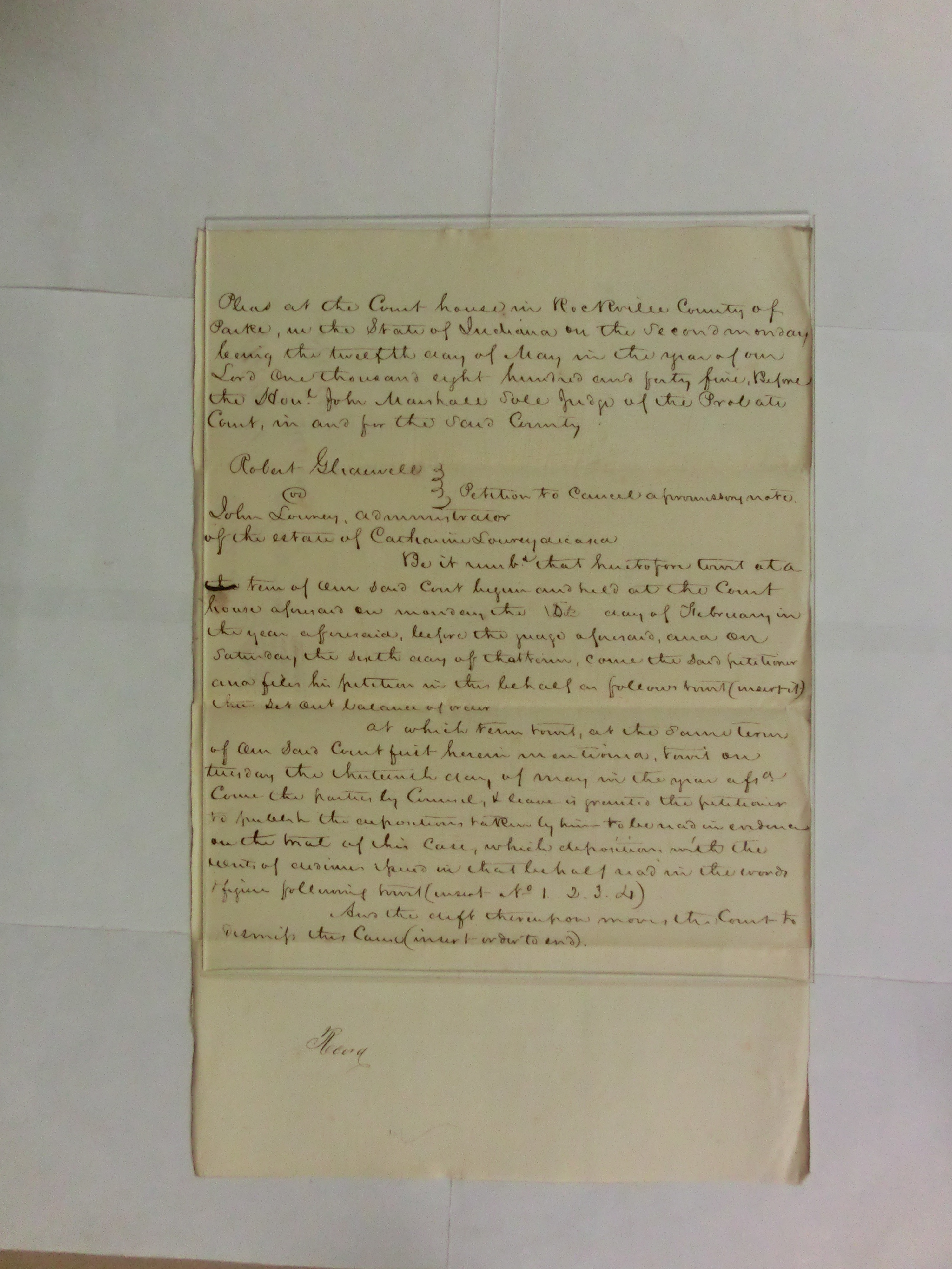 Pleas of the Court house in Rockview County of Parke, in the State of Indiana on the second monday being the twelfth day of May in the year our Lord one thousand eight hundred and forty five. Before the Hous. John Marshall sole Jus… of the Probate Court in and for the said County.