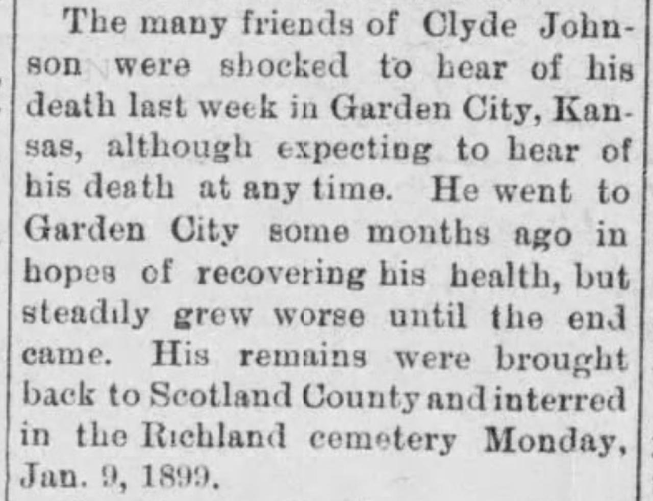 deathGarden City, Kansas, United States ⇓ Clyde died from tuberculosis at the Kankakee hotel in Garden City Kansas. 2 Sources ⇓ |