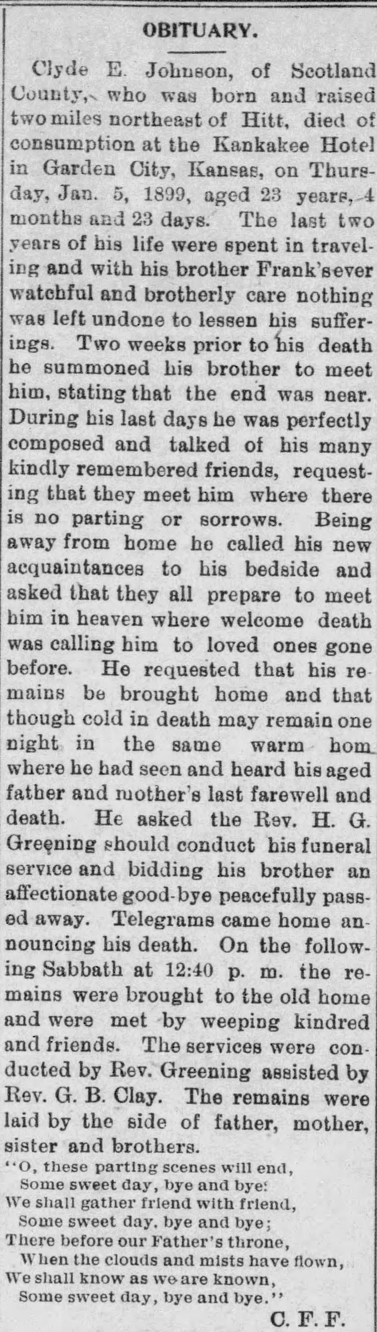 Clyde Johnson obituary in the The Memphis Reveille - Thu, Jan 12, 1899.
