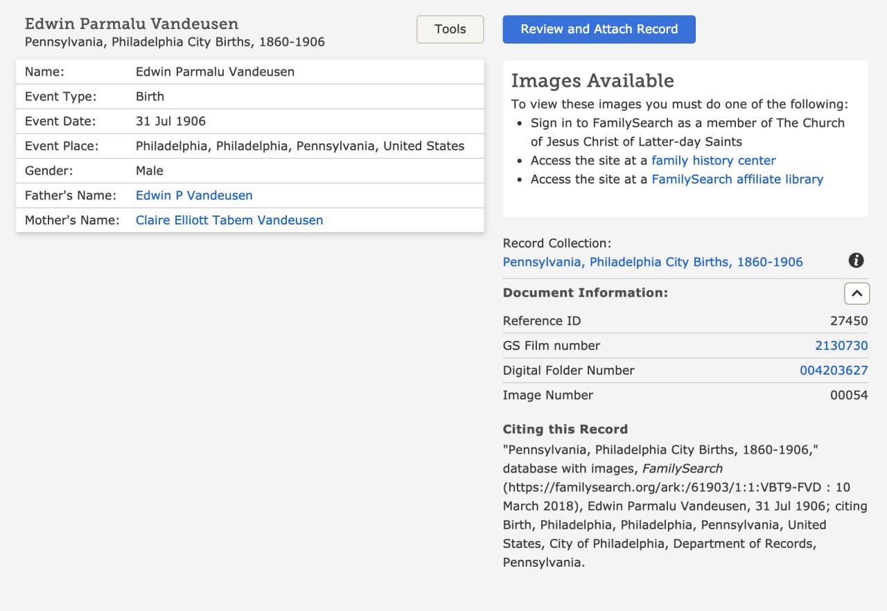 birth of childEdwin Parmalee Van Deusen Jr. Philadelphia, Pennsylvania, USA ⇓ 2 Sources ⇓ |