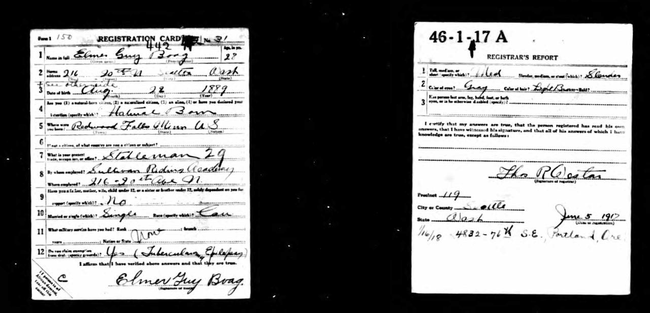 militarySeattle, King, Washington, USA ⇓ World War I Draft Registration Working as a Stableman at Sullivan Riding Academy 1 Source ⇓ |