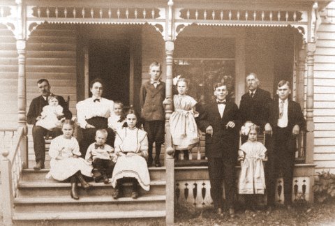 Frank and Mary Fisher are on the porch, left side. Their ten children are around them, and Mary's father, William Bush Candell, Jr. is on the porch, right side. The baby on Frank's lap is Veronica.