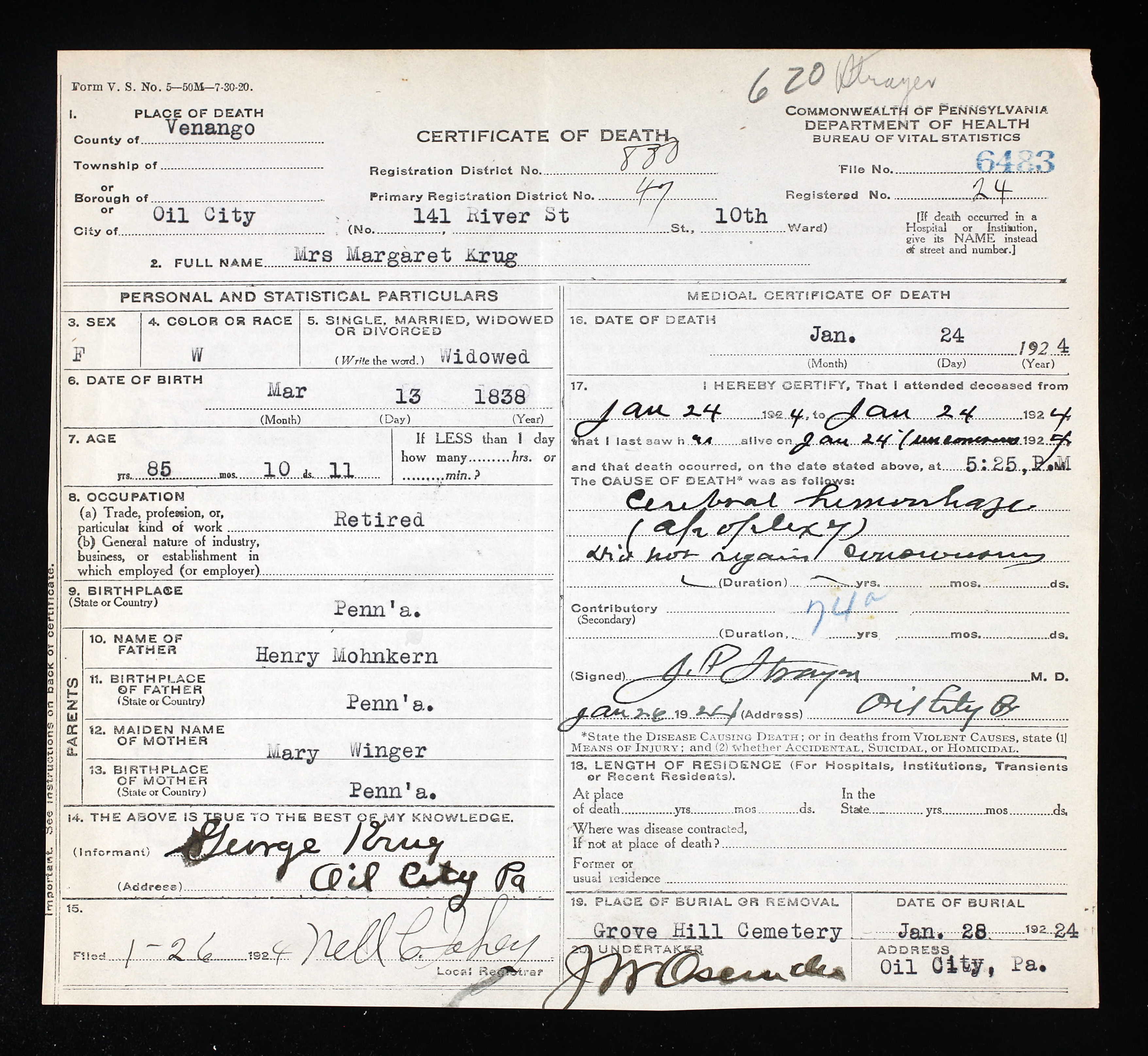 Margaret Ann Mohnkern - Pennsylvania Death Certificate