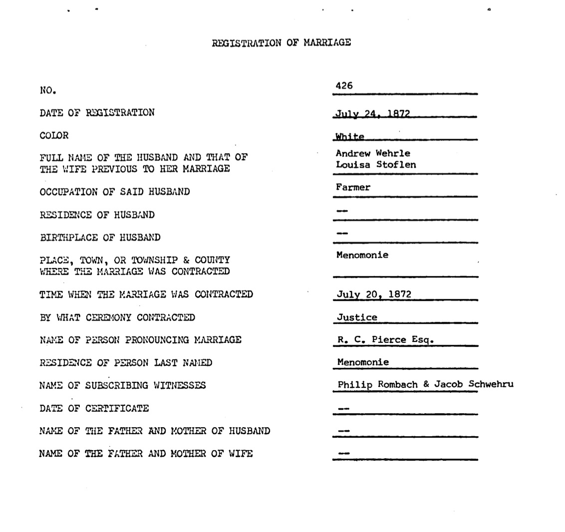 Andrew Wehrle & Louisa Stoflen - Marriage Record