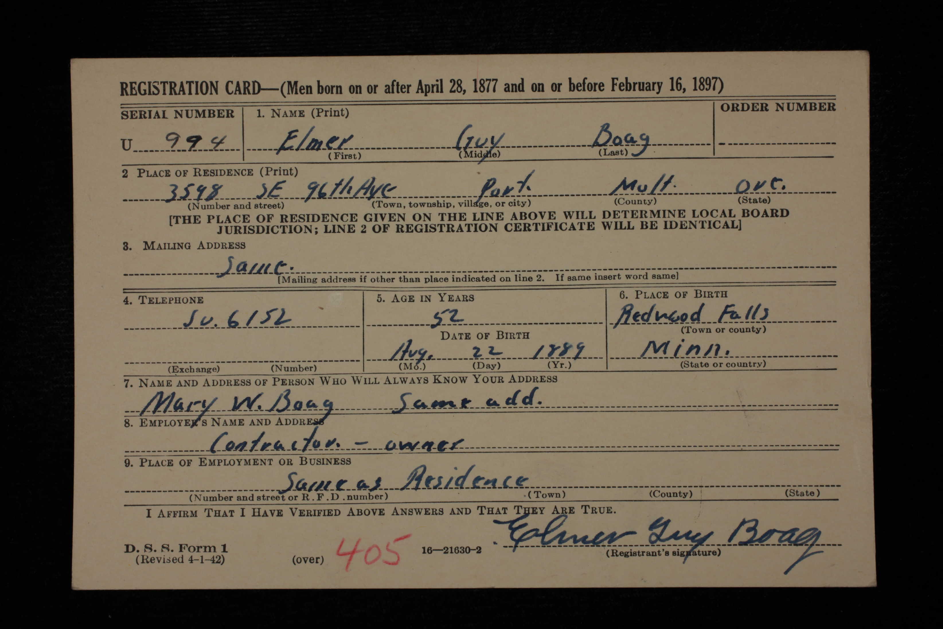 Elmer Guy Boag Sr. - World War II Draft Registration