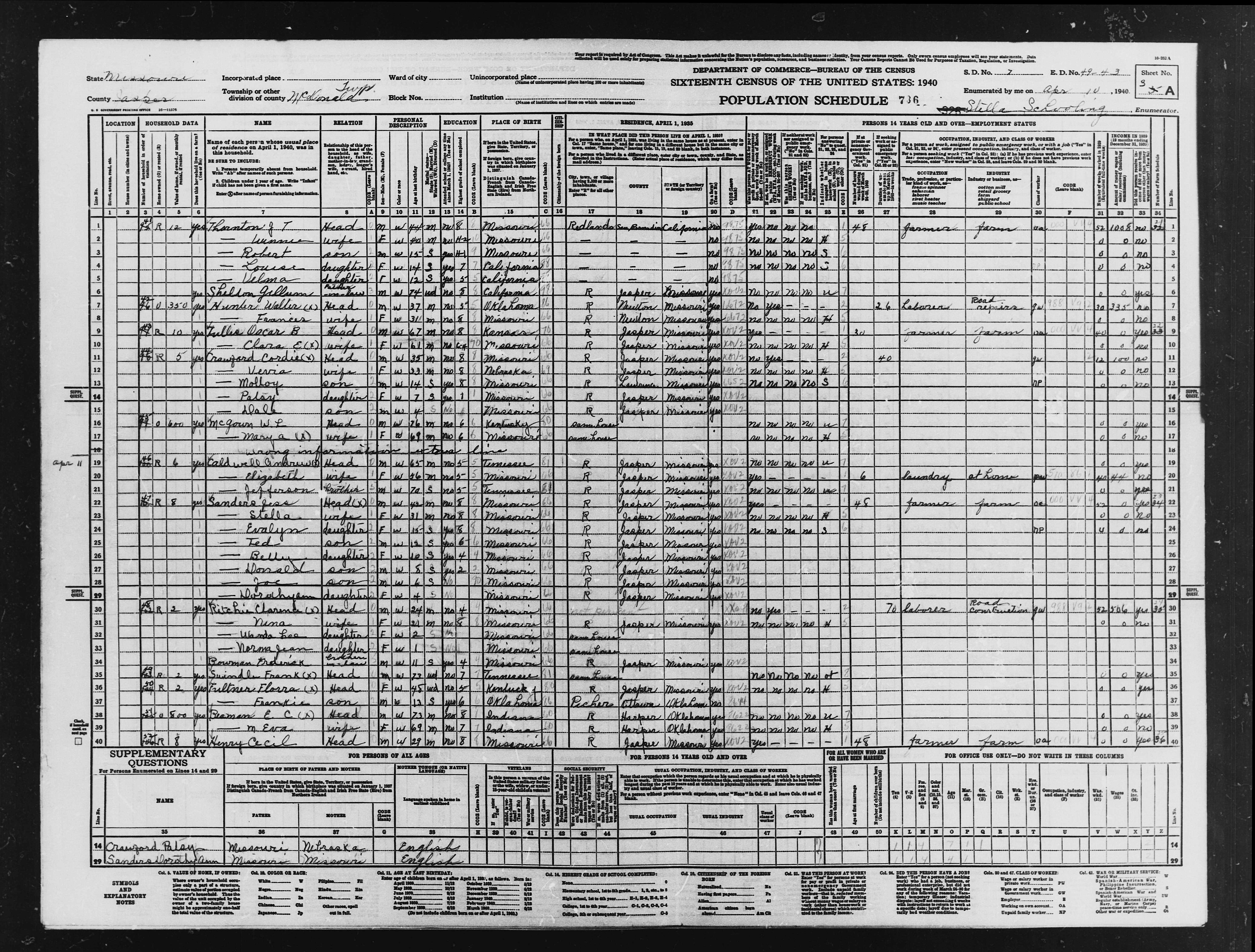 John Thomas Thornton Family - 1940 United States Federal Census