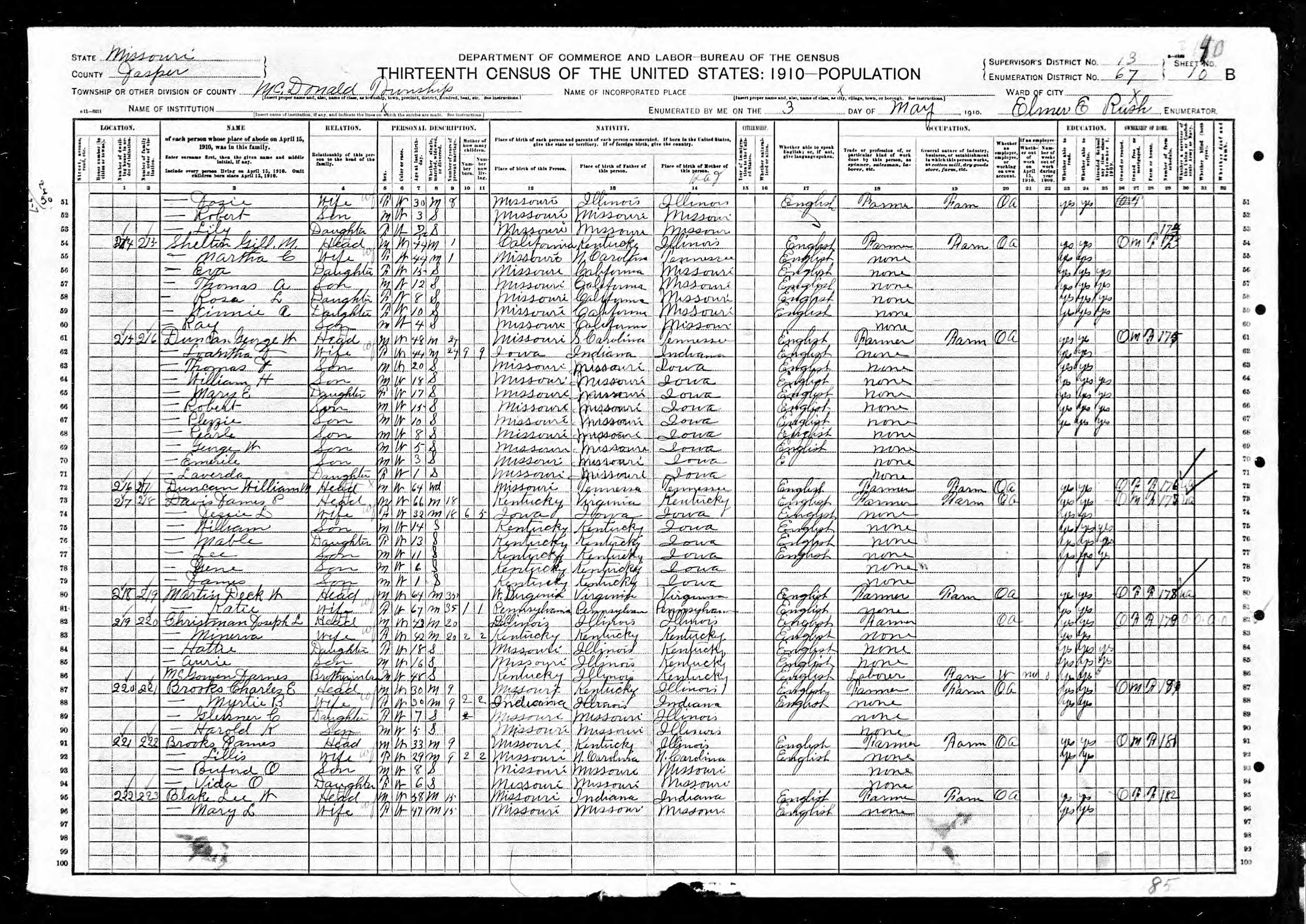 Gill M Shelton Family - 1910 United States Federal Census
