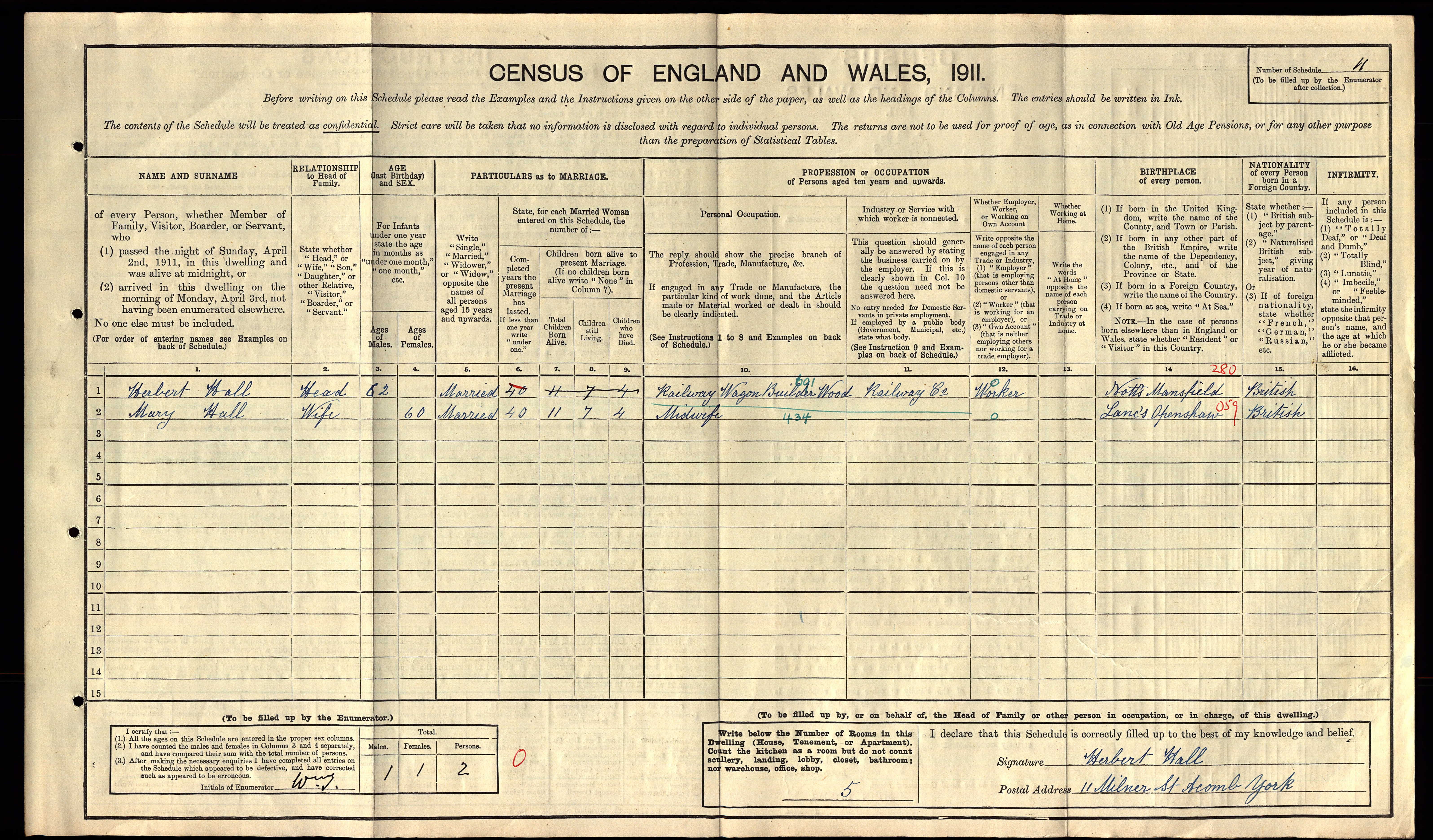Herbert Hall & Mary Kenyon - 1911 England Census