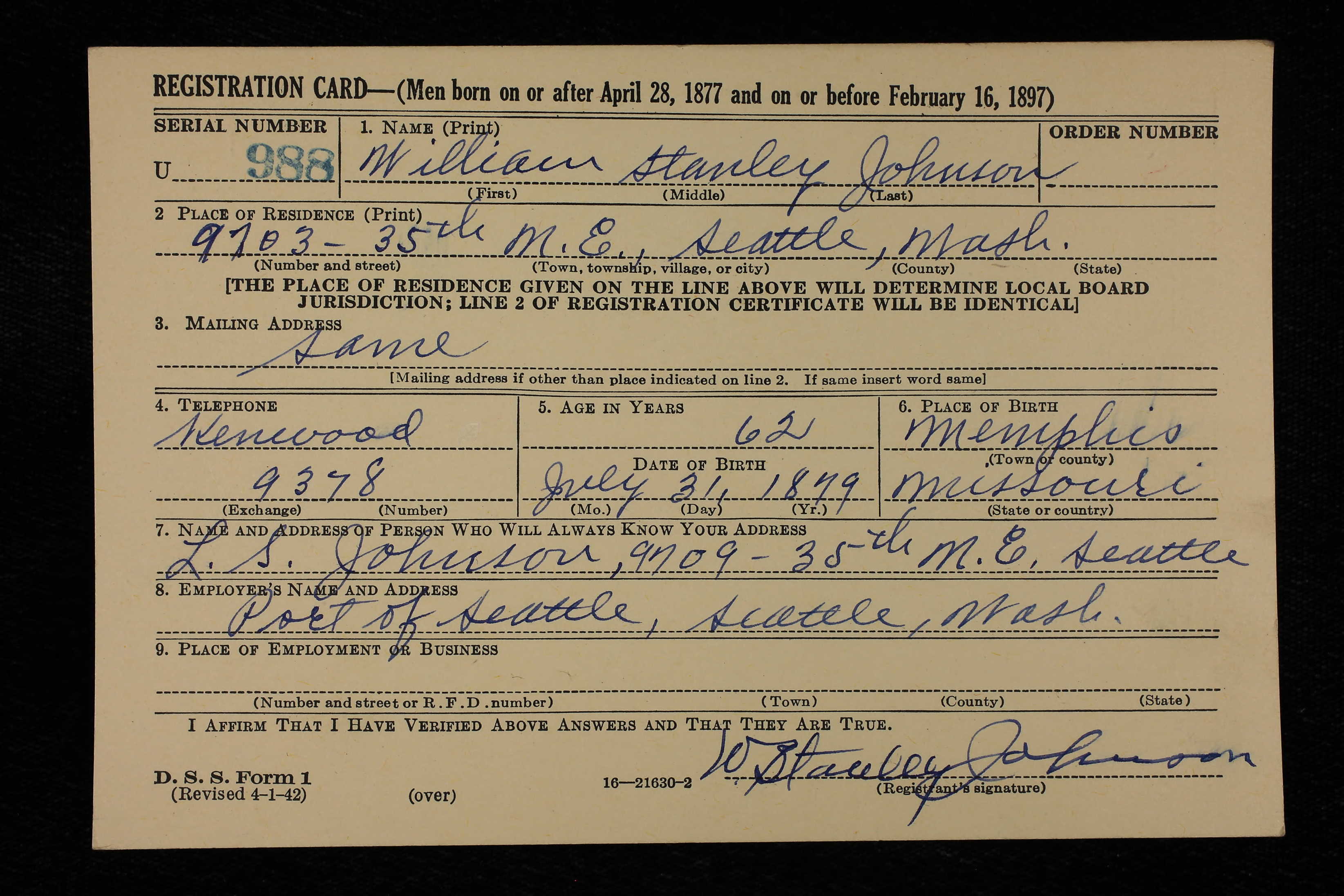 William Stanley Johnson - World War II Draft Registration