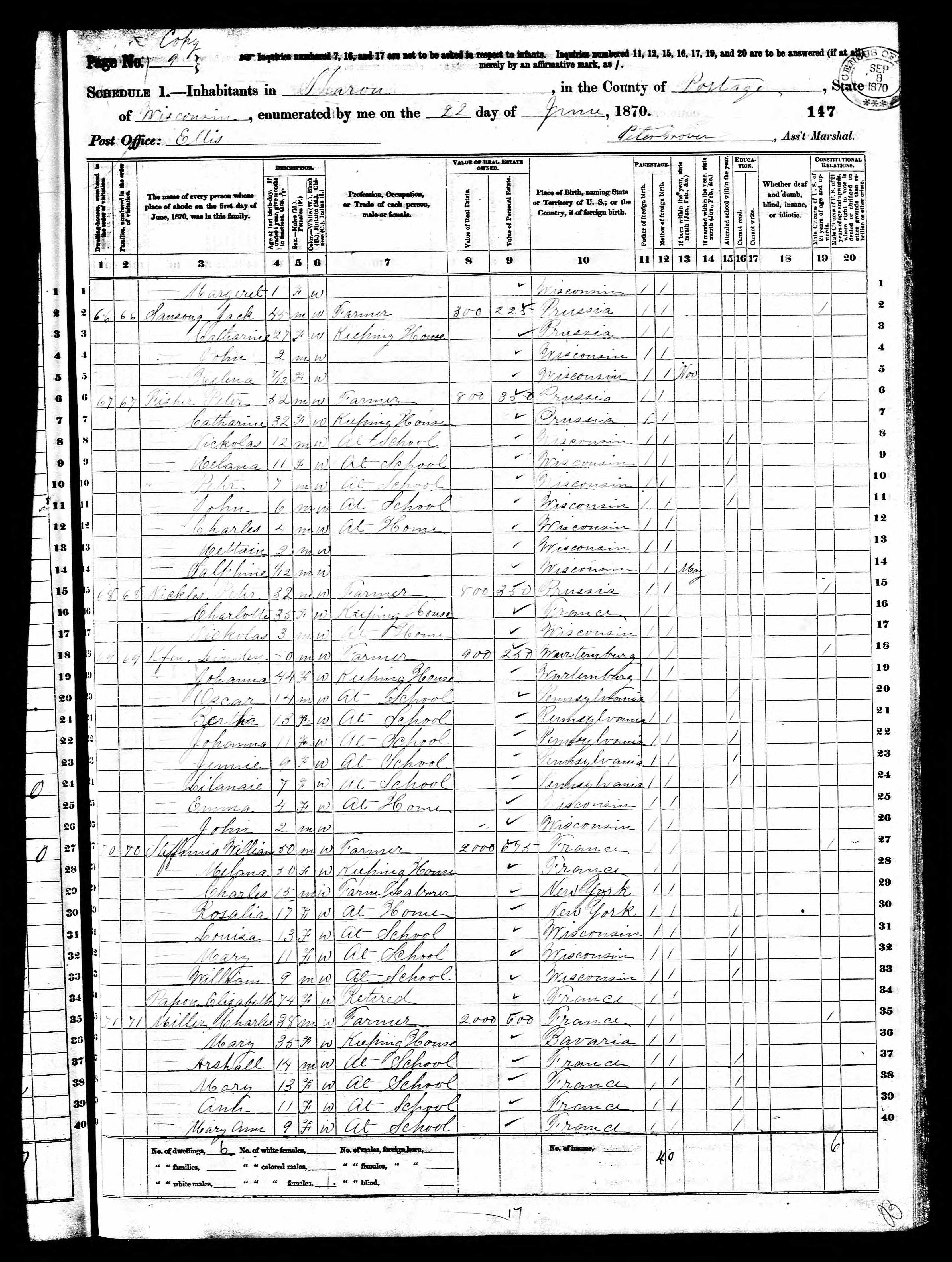 Peter Fisher Sr. Family - 1870 United States Federal Census