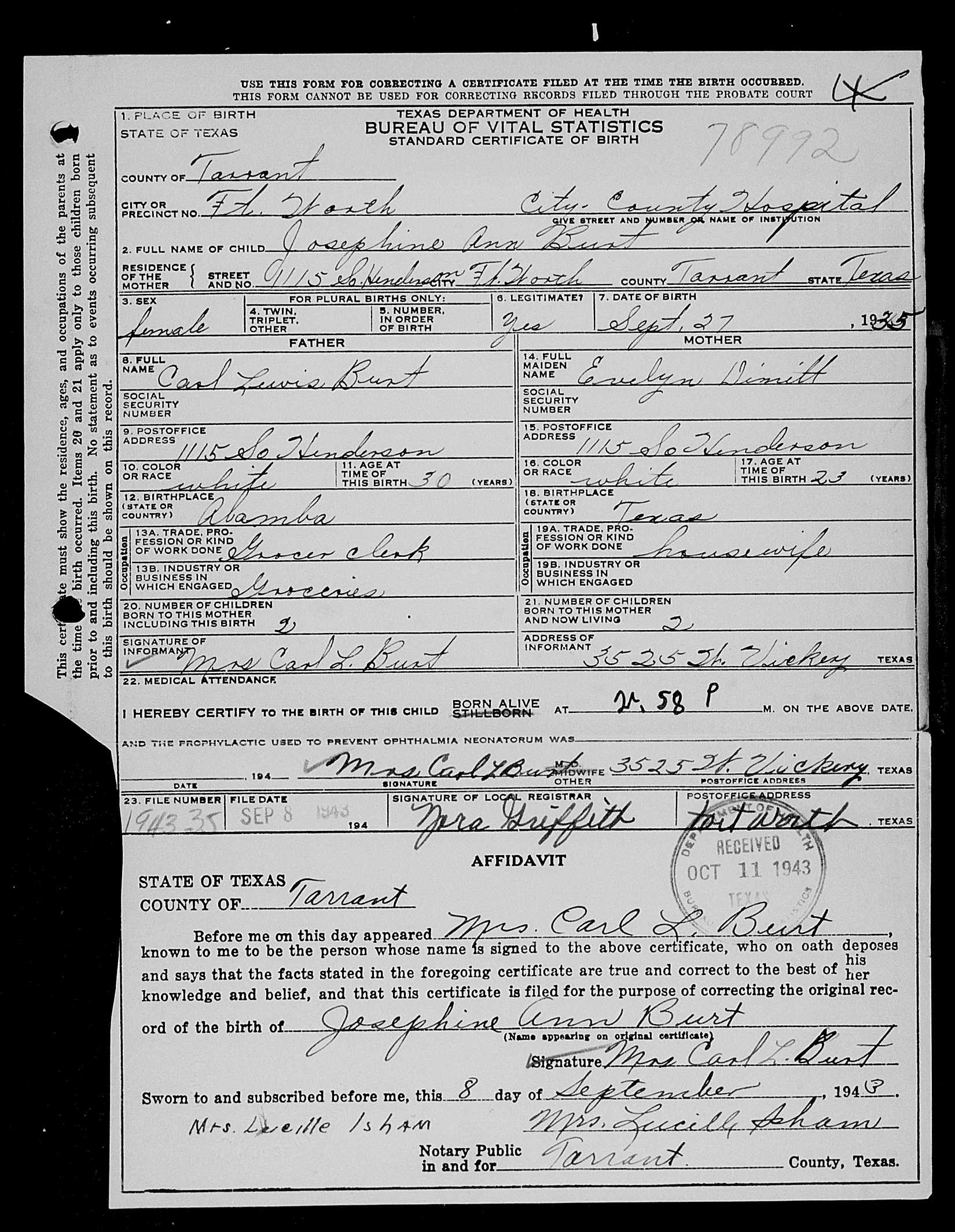 Josephine Ann Burt - Texas Birth Certificate
