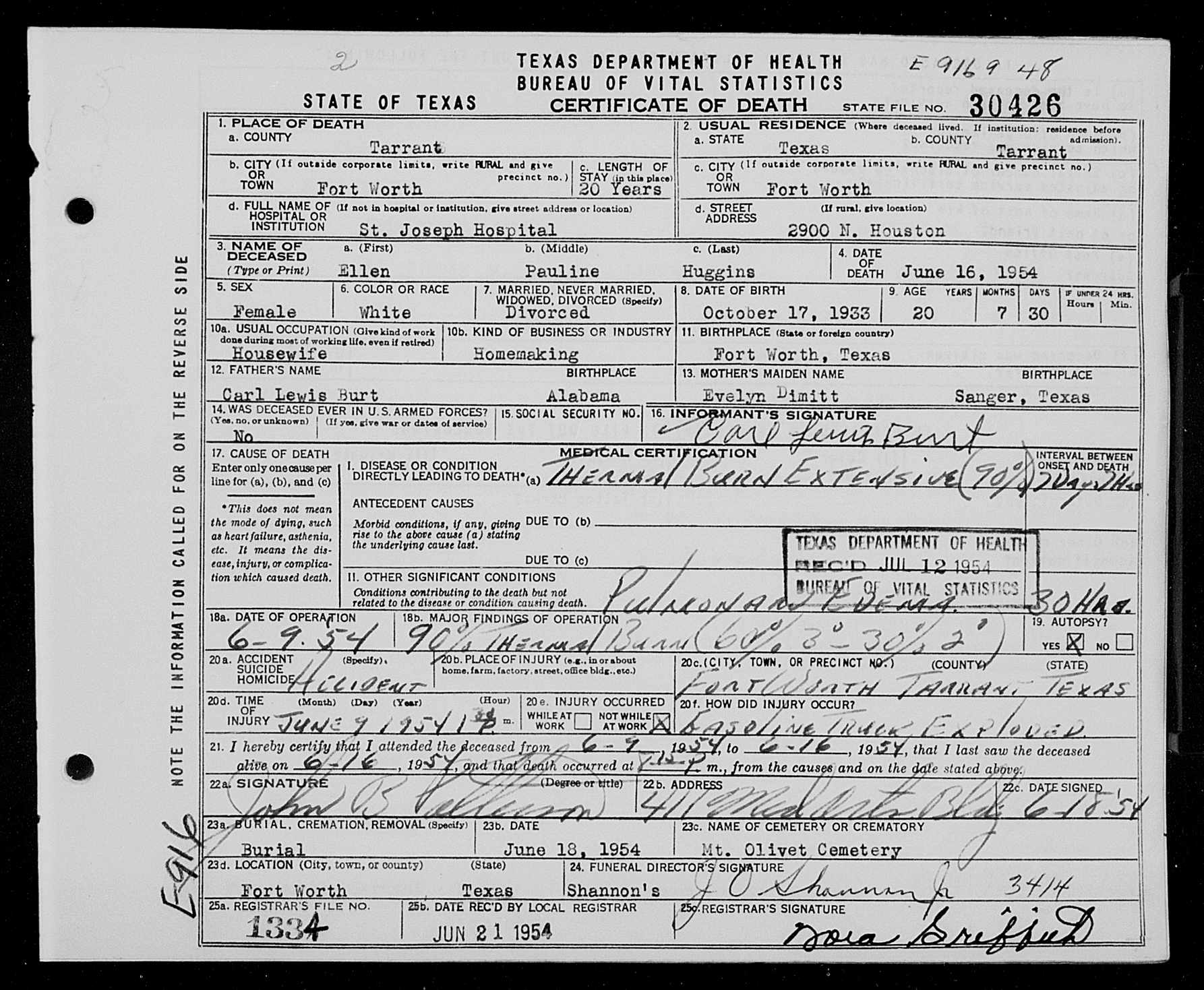 Ellen Pauline Burt - Texas Death Record