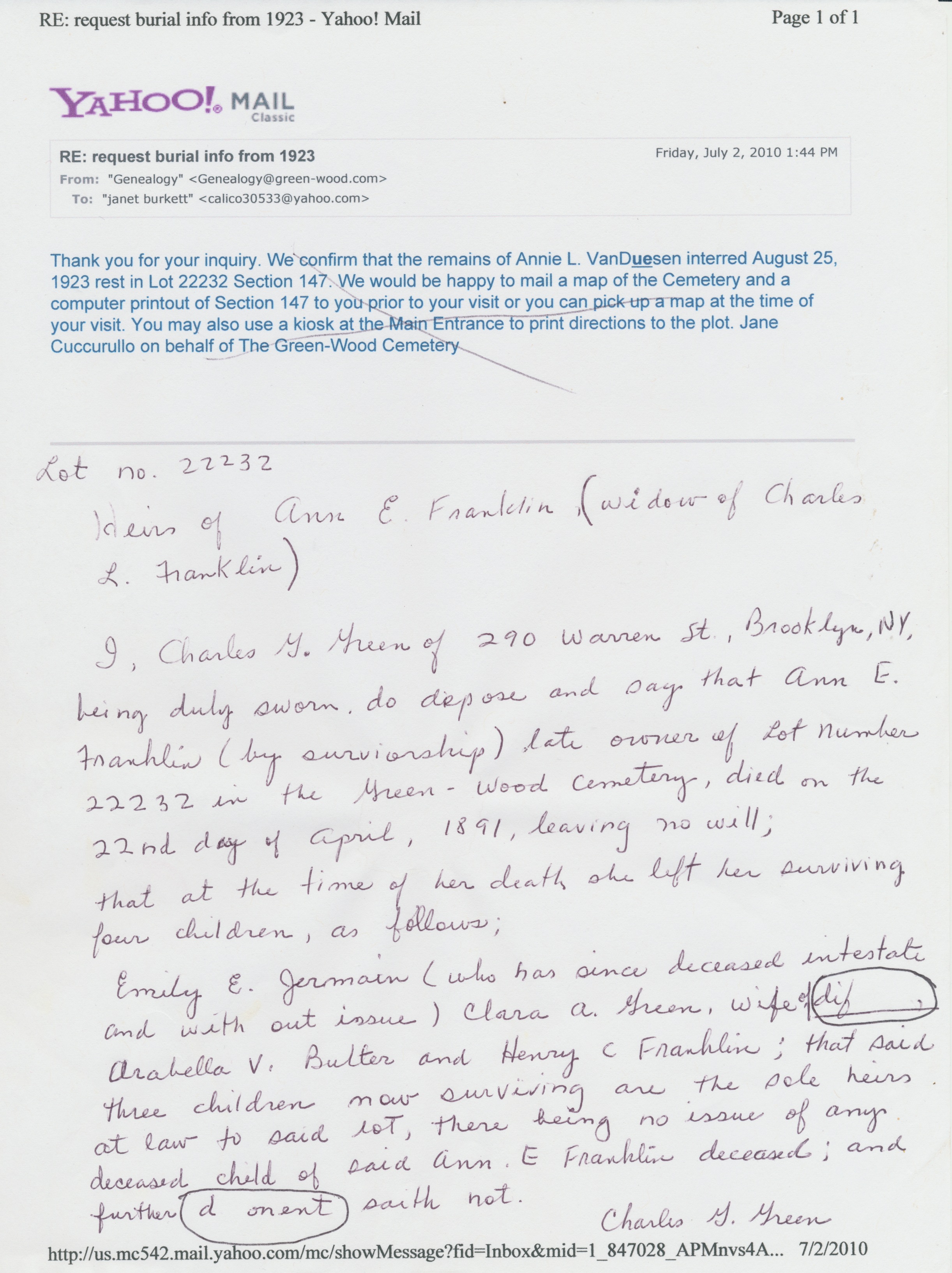 Anna Eliza Lott - Deposition on death date