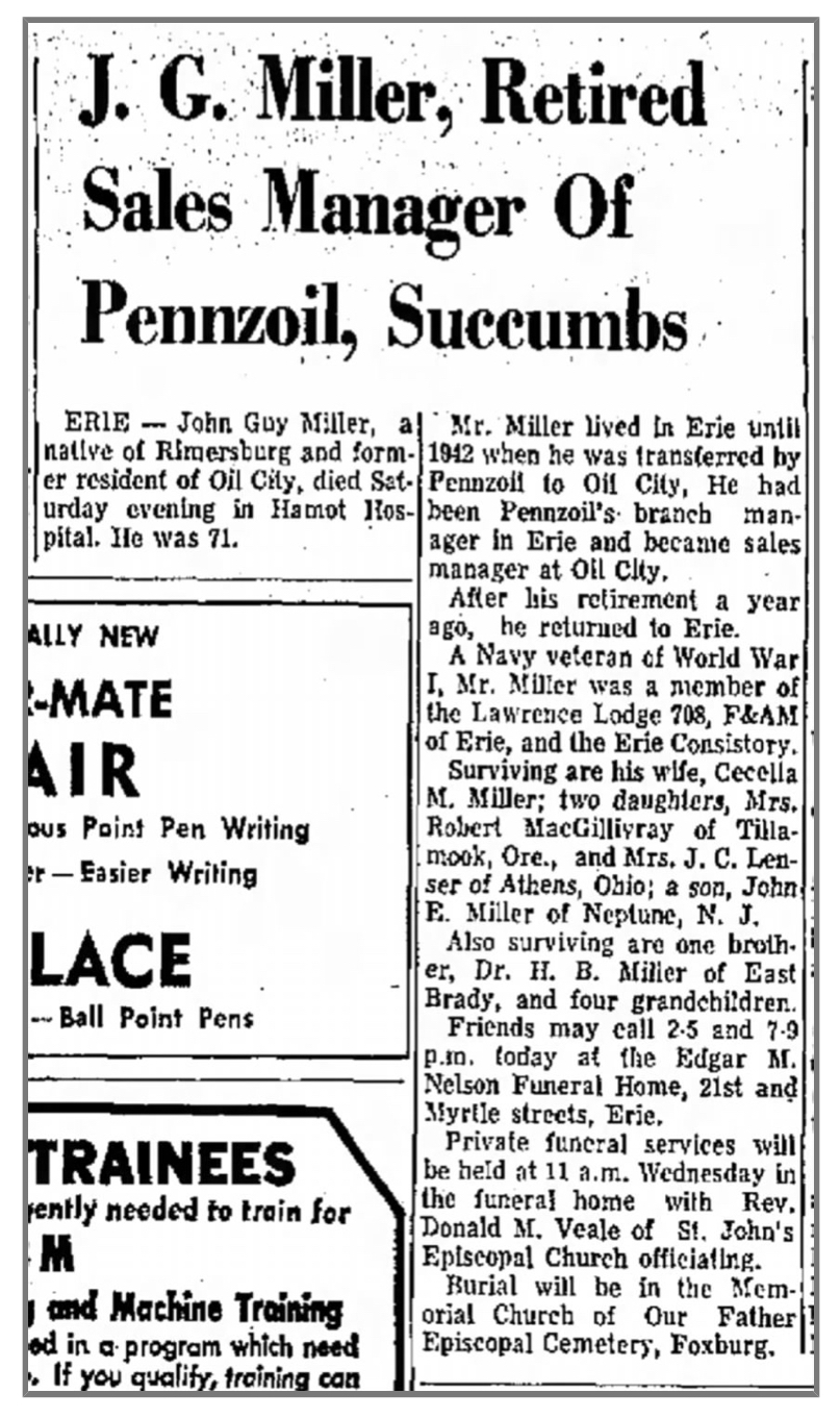 John Guy Miller - Obituary from the Oil City Derrick