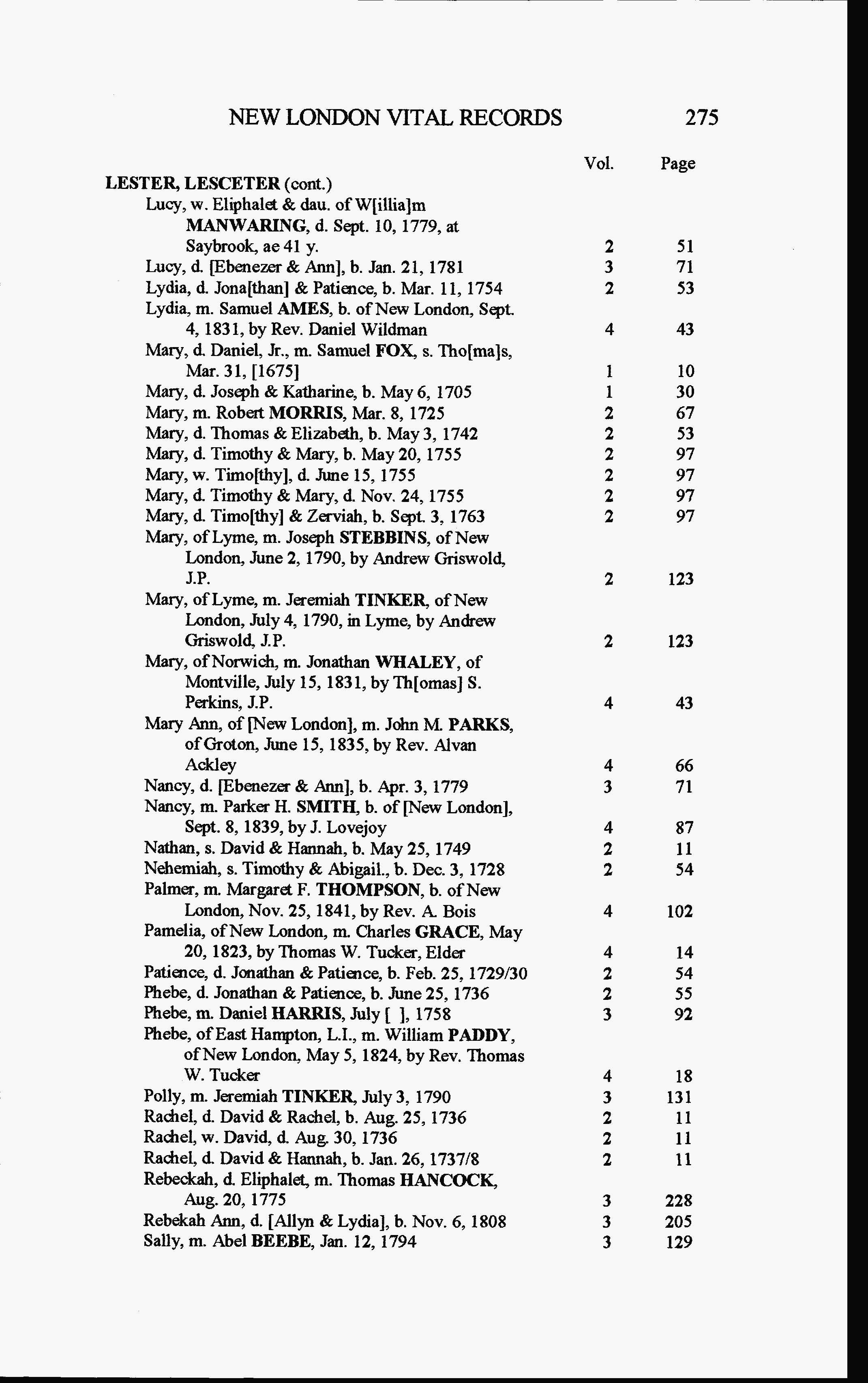 Mary Lester - Connecticut Town Birth Records, pre-1870 (Barbour Collection)