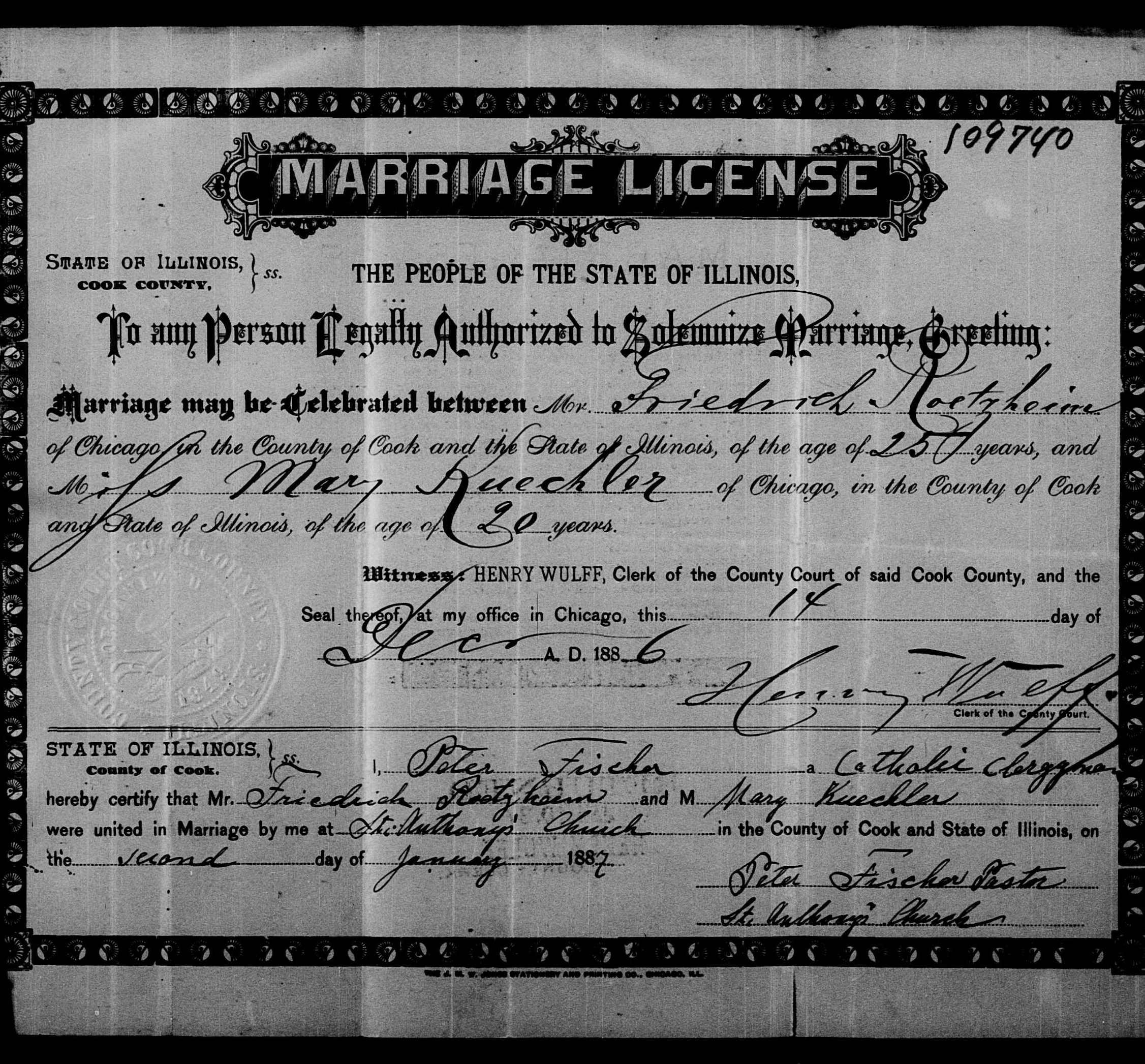 Friederich Roetzheim & Mary Kuechler - Marriage Record
