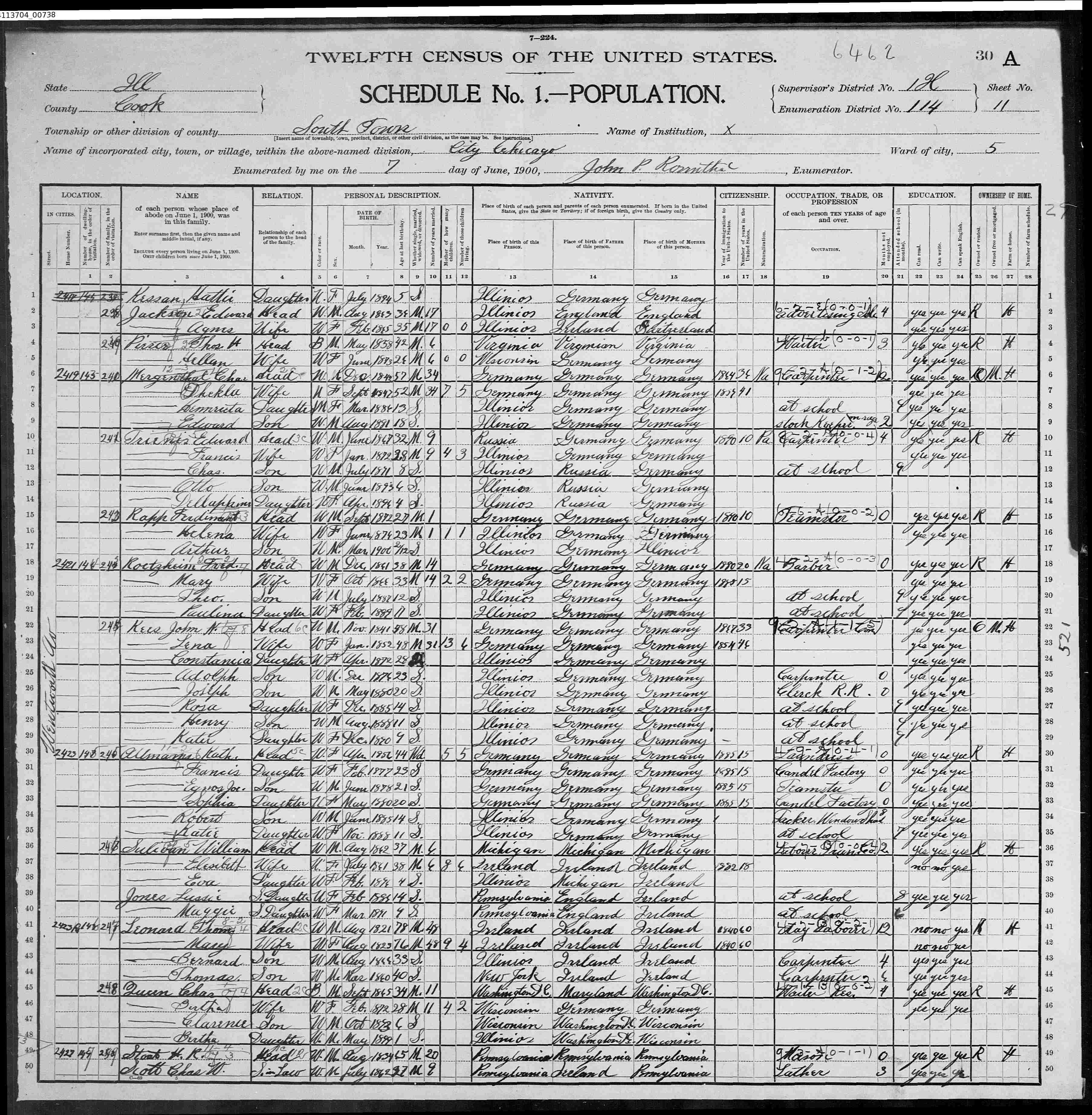 Fredriech Roetzheim - 1900 United States Federal Census