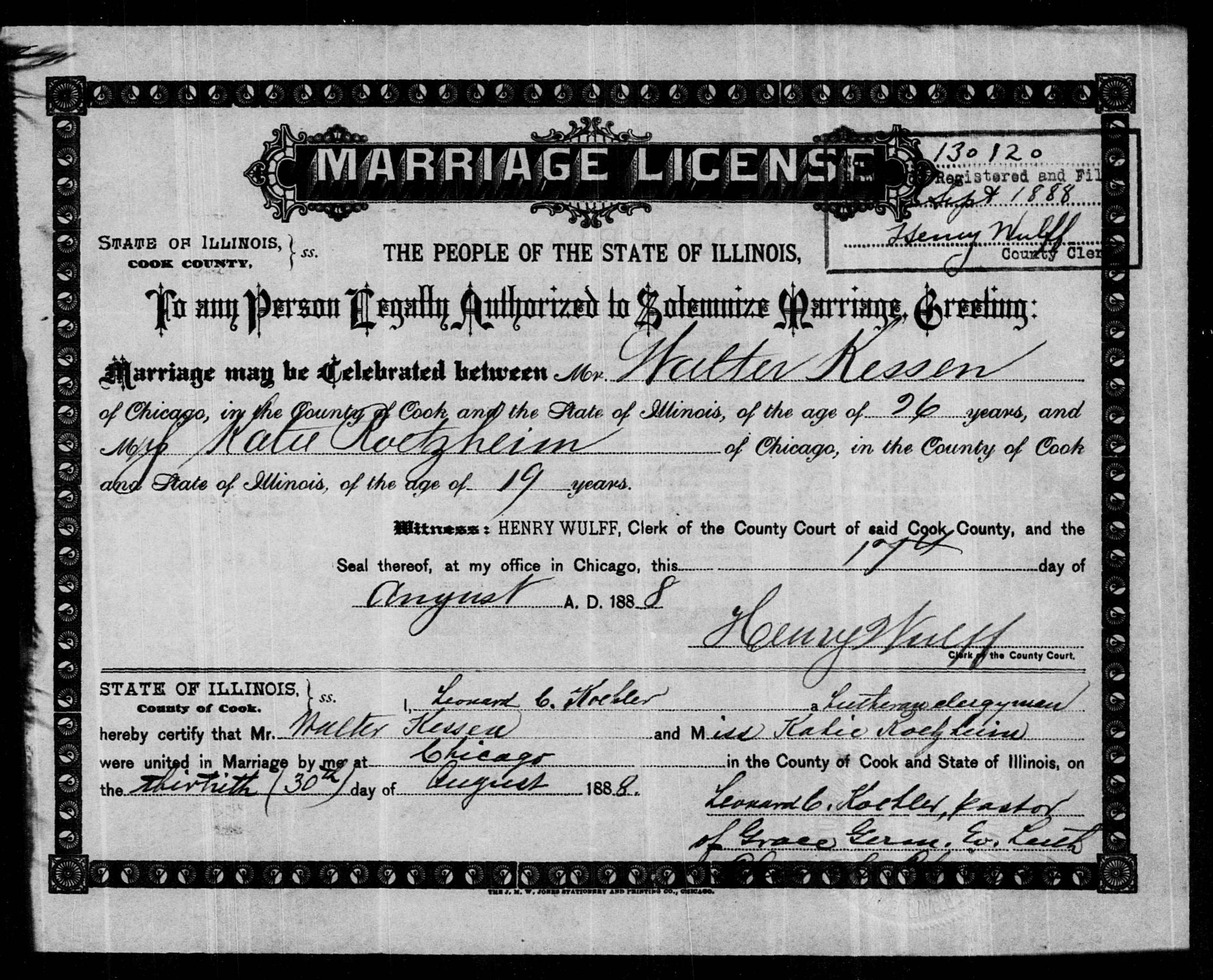 Catharina Roetzheim & Walter Kessen - Cook County, Illinois, Marriages Index, 1871-1920