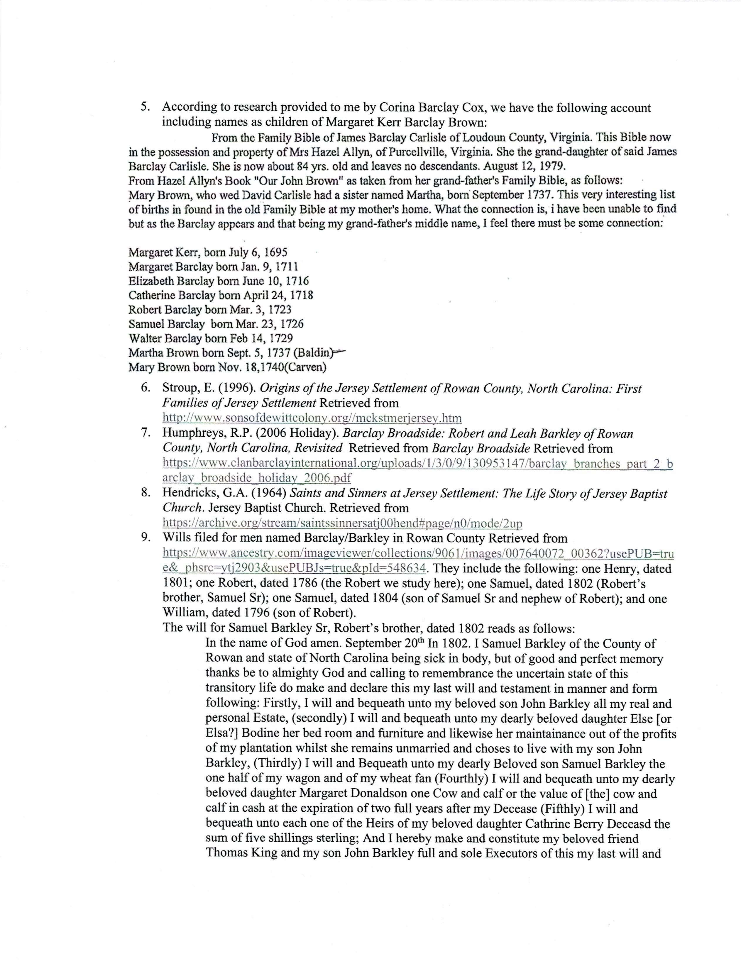 Mrs. Margaret Kerr BrownIn 78th yearHer will 25 Mar 1765 proved 16 Oct 1769 names daughters Martha and Mary and sons Samuel Barkley, Robert Barkley and a Walter Barkley. No Margaret. ( The will was from her 2nd husbands estate and provided for his two daughters and 3 stepsons- The 3 other daughters by first marriage may have been given a dowry at marriage)