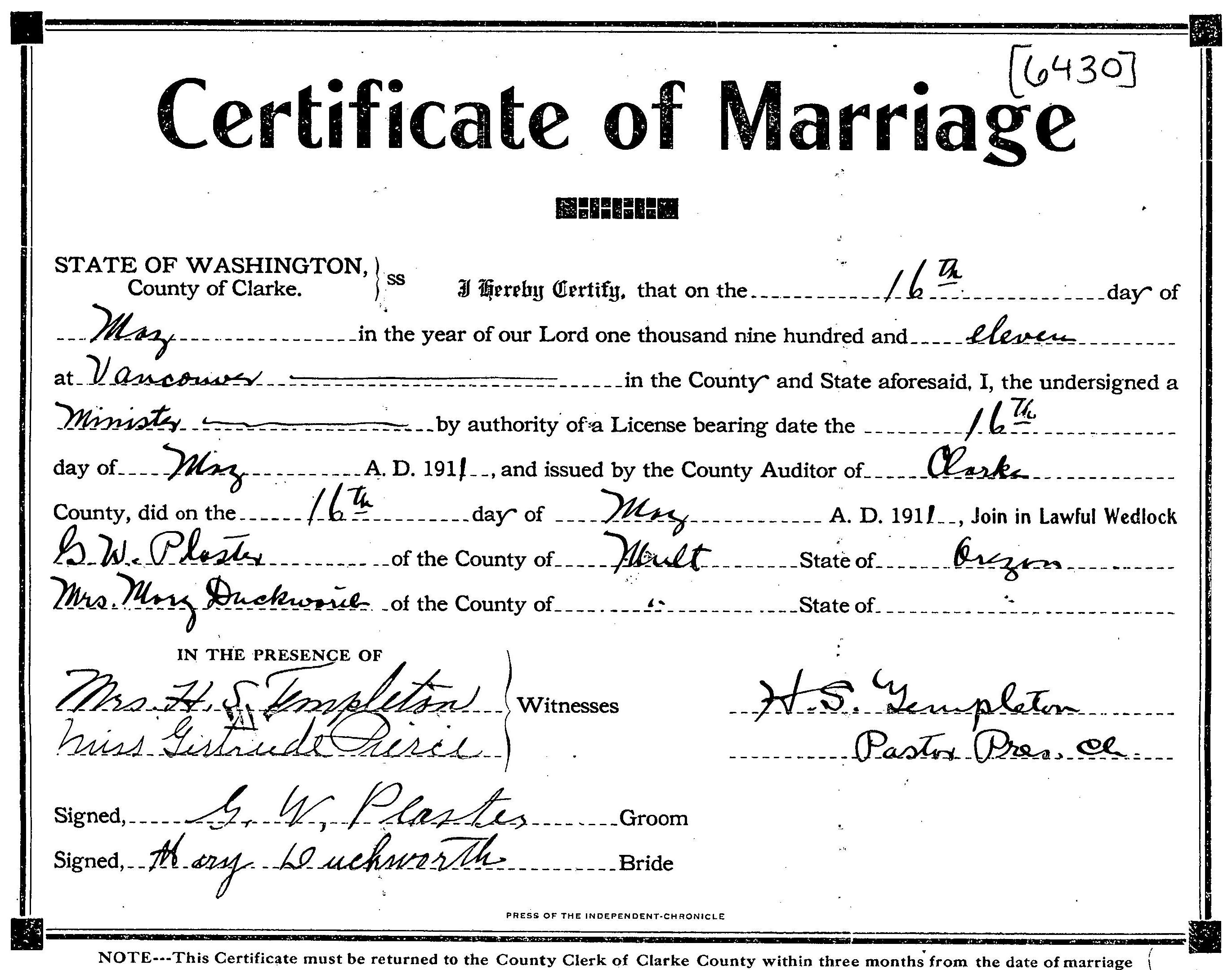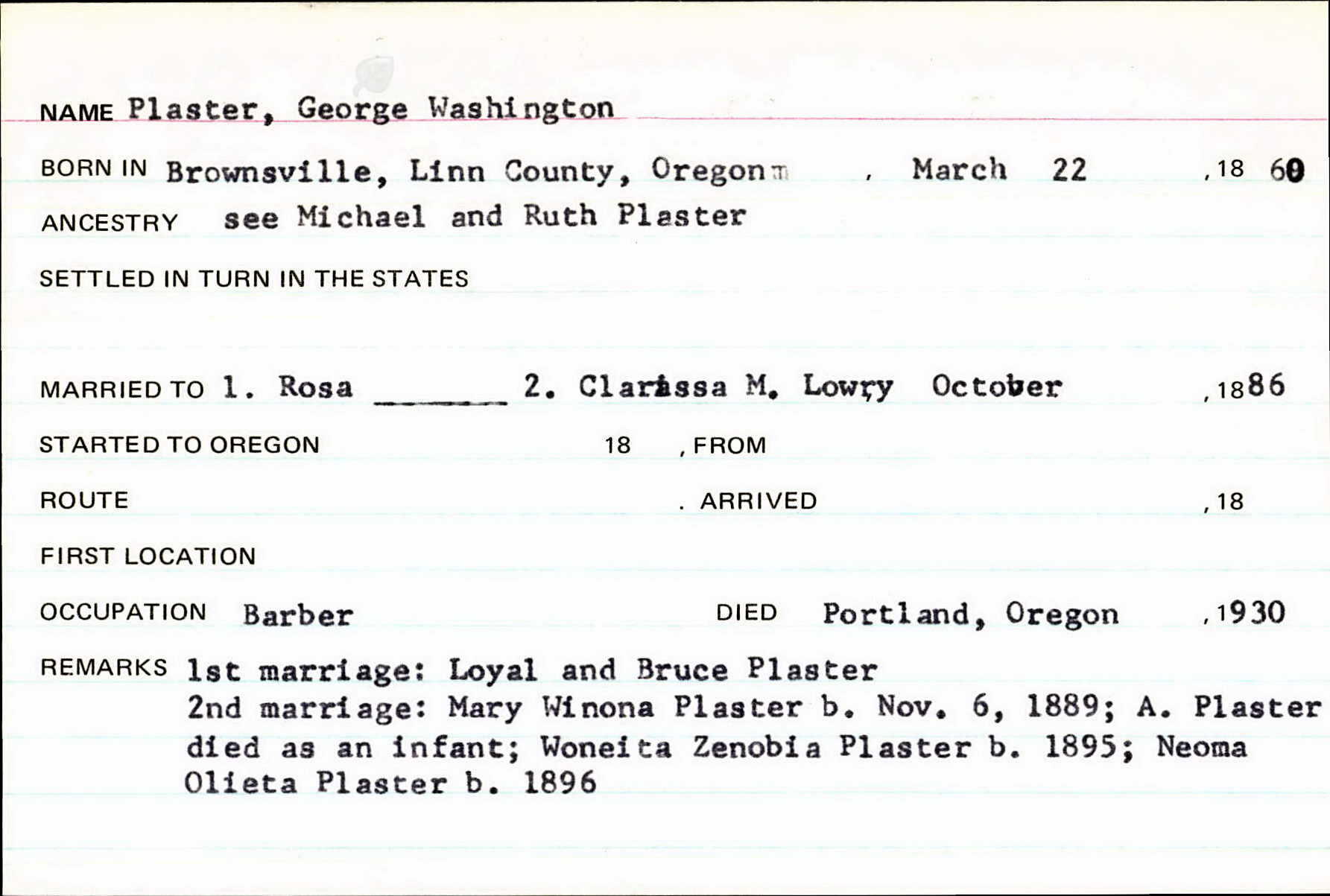 Children:1st marriage: Loyal (1879–1898; buried in Lebanon) and Bruce Plaster (1882–1922; d. in San Francisco)2nd Marriage: Mary Winona Plaster (1889-1963), Leon A. Plaster (1894-1894), Woneita Zenobia Plaster (1895-1968), and Neoma Olieta Plaster (1896-1985)
