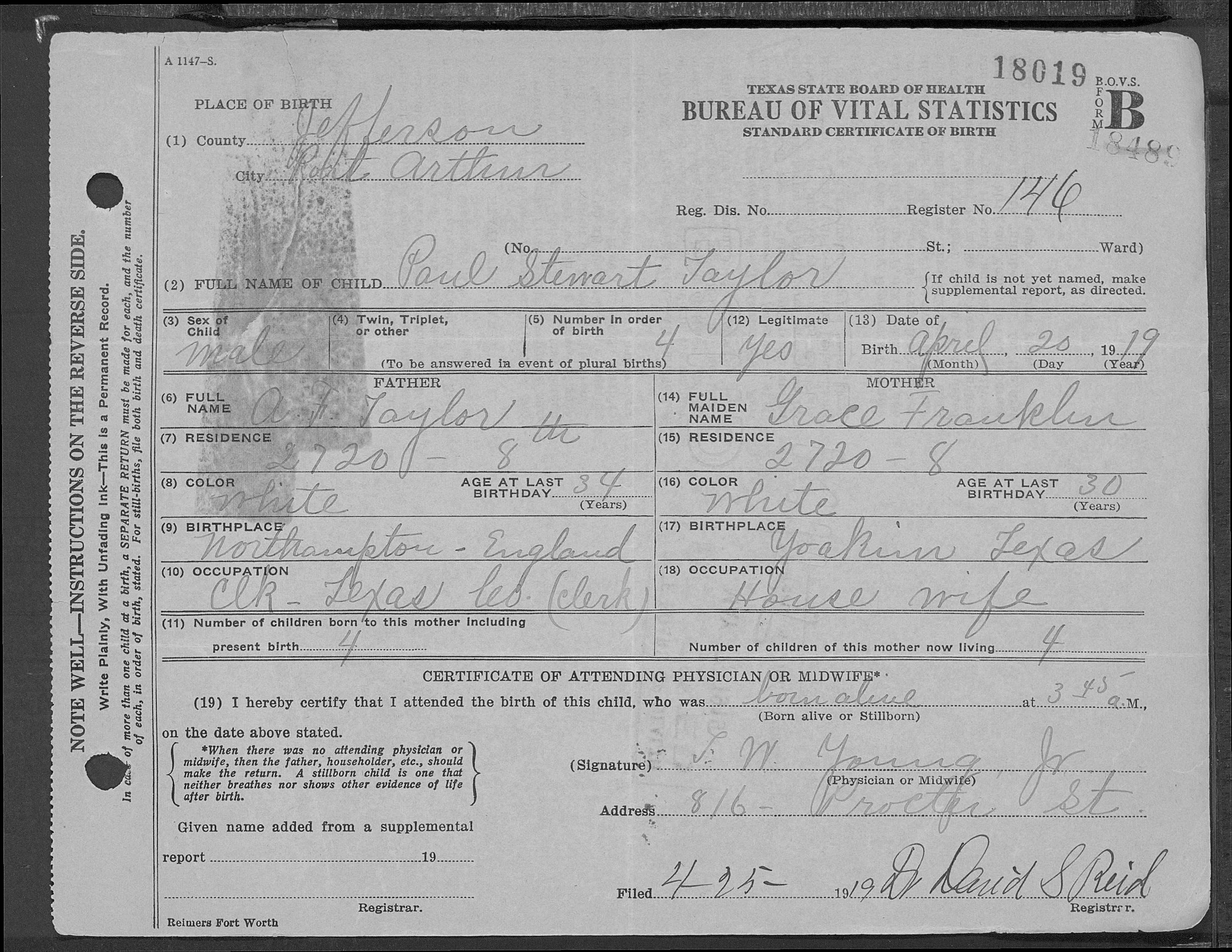Paul Stewart Taylor - Texas Birth Record