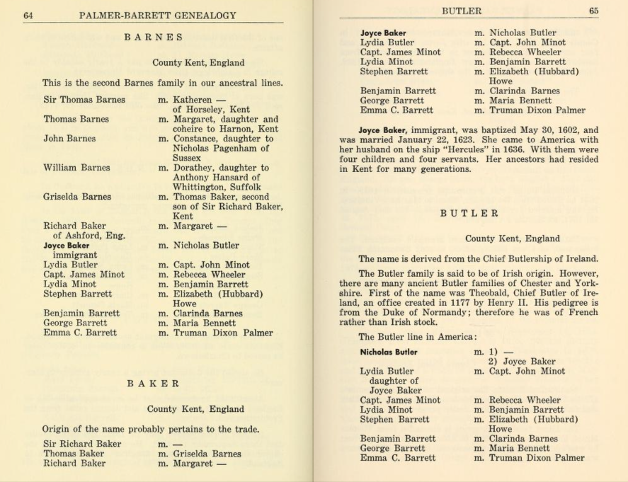 Barnes & Baker - The Ancestral Lines of Truman Dixon Palmer and Emma Calista Barrett with Descendants Copyright 1900