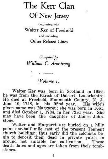 Margaret married Walter Ker in 1677 in Scotland. They had six children: James Ker, Margaret Ker, John Ker, Joseph Ker, William Ker and Samuel Ker.