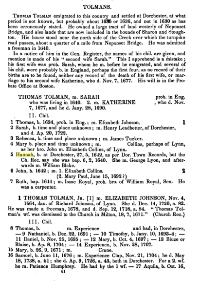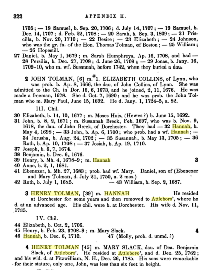 3. Henry Tolman [39] m. Hannah _____. He resided at Dorchester for some years and then removed to Attleboro', where he d. at an advanced age. His chil. were b. at Dorchester. His wife d. Nov. 11, 1735.