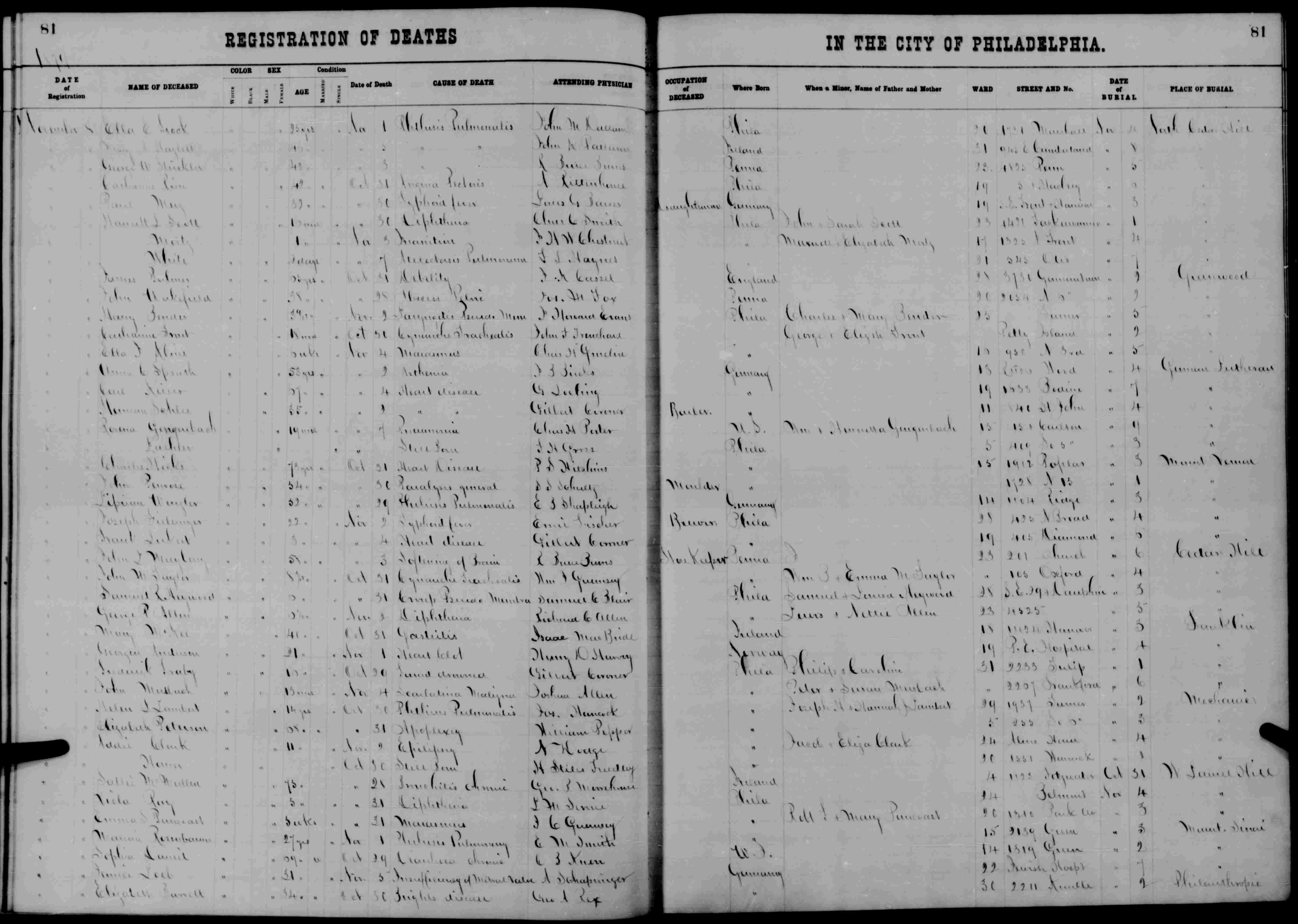 "Pennsylvania, Philadelphia City Death Certificates, 1803-1915," database with images, FamilySearch ( https://familysearch.org/ark:/61903/1:1:VK8G-7HD : accessed 27 February 2016), Charles Hicks, 31 Oct 1879; citing v B p 81, Philadelphia City Archives and Historical Society of Pennsylvania, Philadelphia; FHL microfilm 1,003,705.