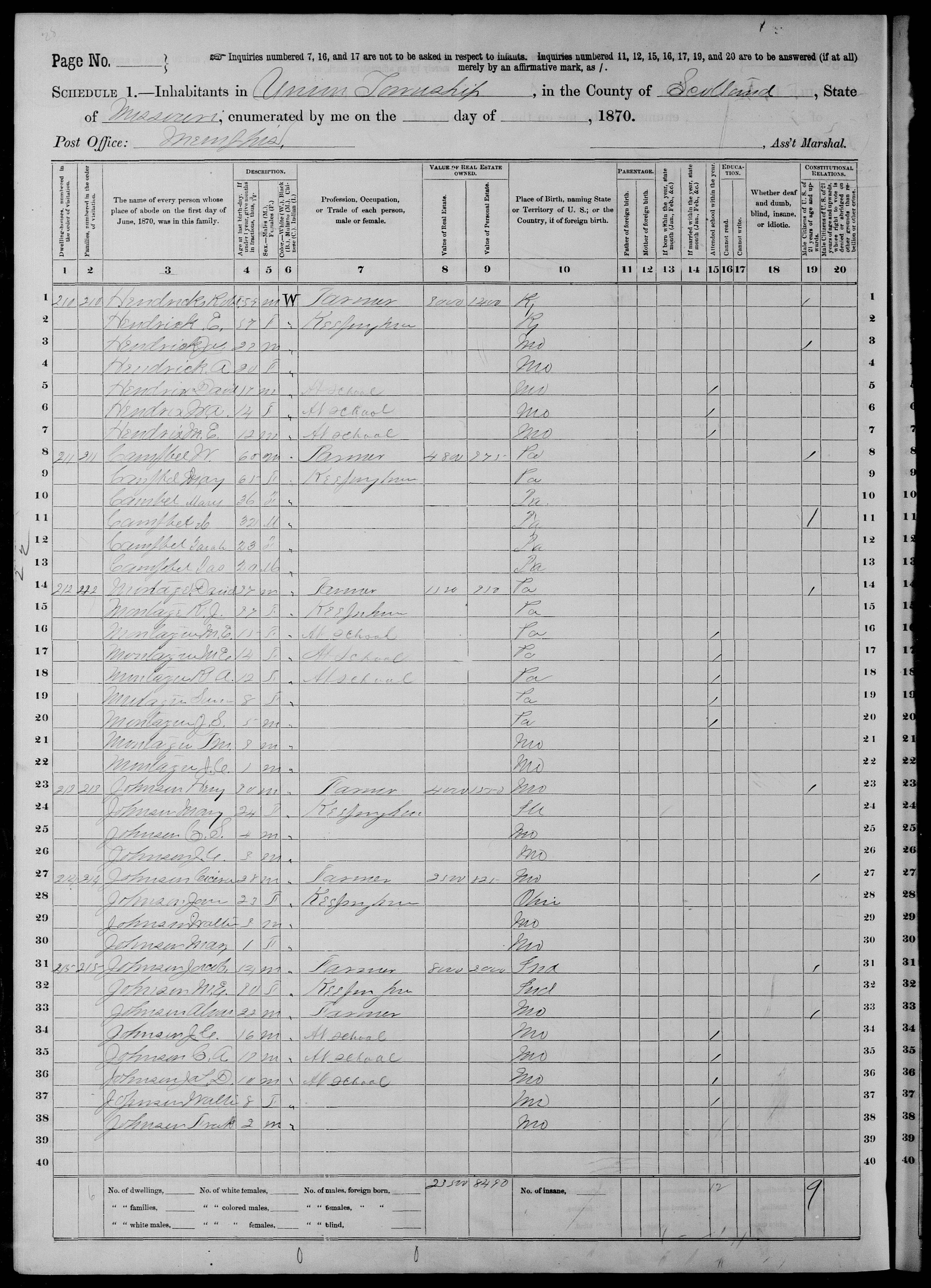 "United States Census, 1870," database with images, FamilySearch ( https://familysearch.org/ark:/61903/1:1:M4XN-FBR : 17 October 2014), Hery Johnsen, Missouri, United States; citing p. , family 213, NARA microfilm publication M593 (Washington D.C.: National Archives and Records Administration, n.d.); FHL microfilm 552,304.