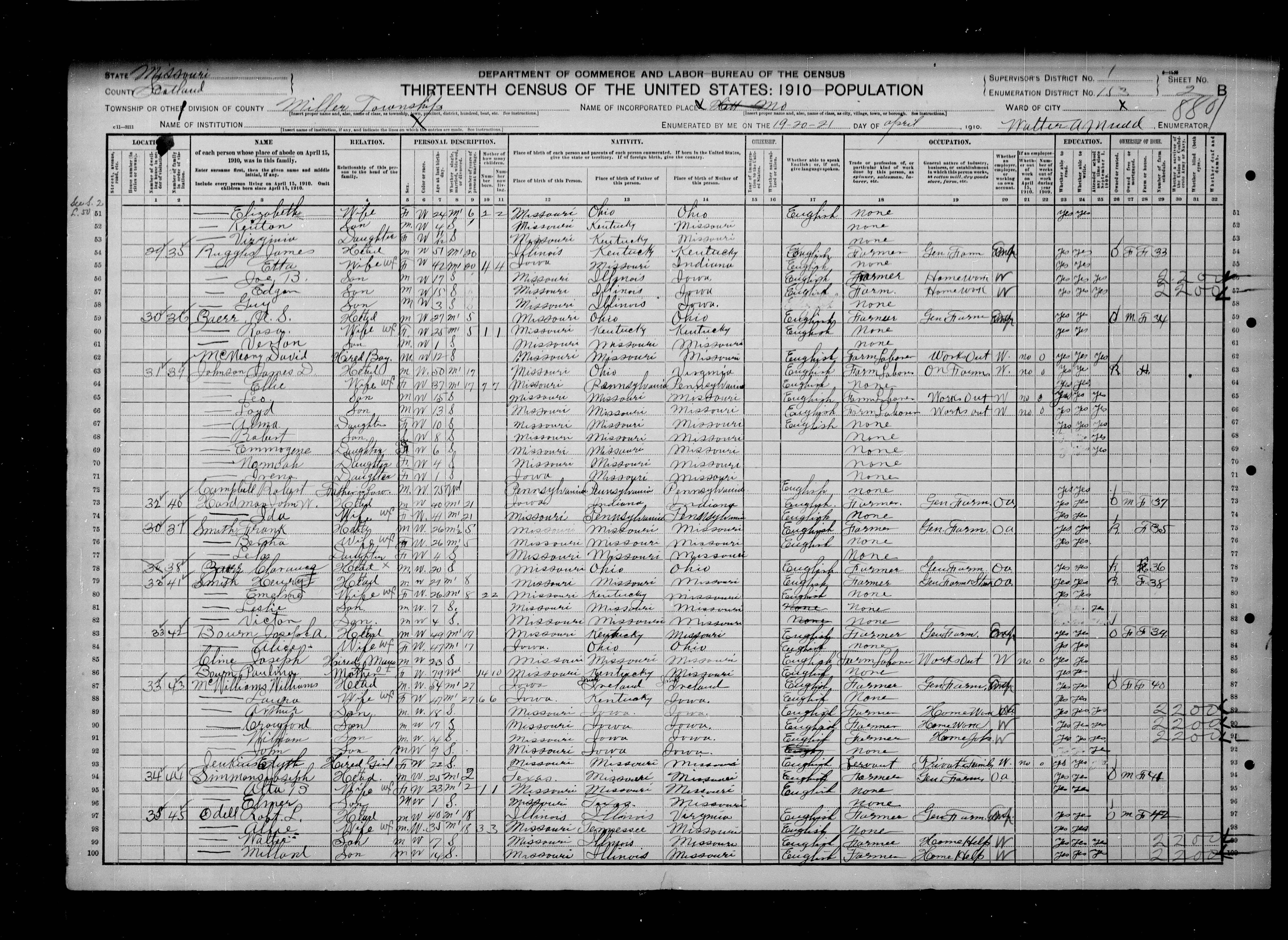 "United States Census, 1910," database with images, FamilySearch ( https://familysearch.org/ark:/61903/1:1:MLMS-PBM : 29 October 2015), James D Johnson, Miller, Scotland, Missouri, United States; citing enumeration district (ED) ED 153, sheet 2B, NARA microfilm publication T624 (Washington, D.C.: National Archives and Records Administration, n.d.); FHL microfilm 1,374,837.