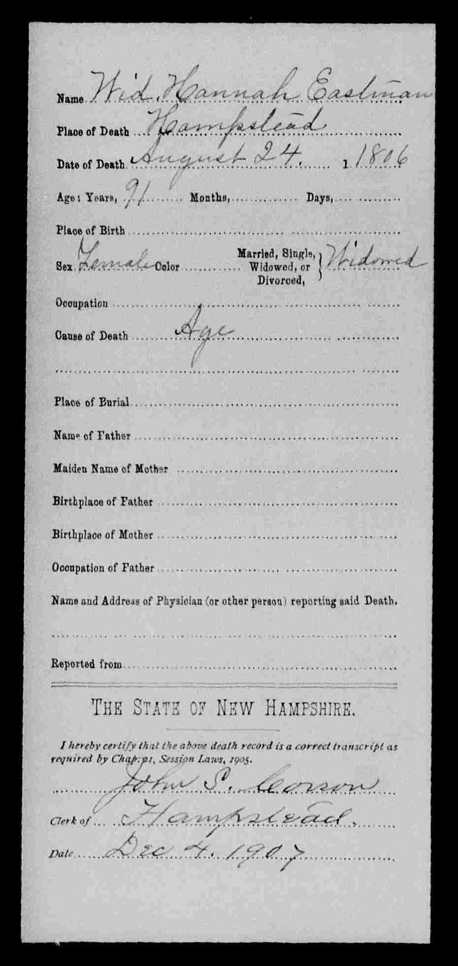 "New Hampshire Death Records, 1654-1947," database with images, FamilySearch ( https://familysearch.org/ark:/61903/1:1:FSK1-5PB : 12 December 2014), Hannah Eastman, 24 Aug 1806; citing Hampstead, Bureau Vital Records and Health Statistics, Concord; FHL microfilm 1,001,075.