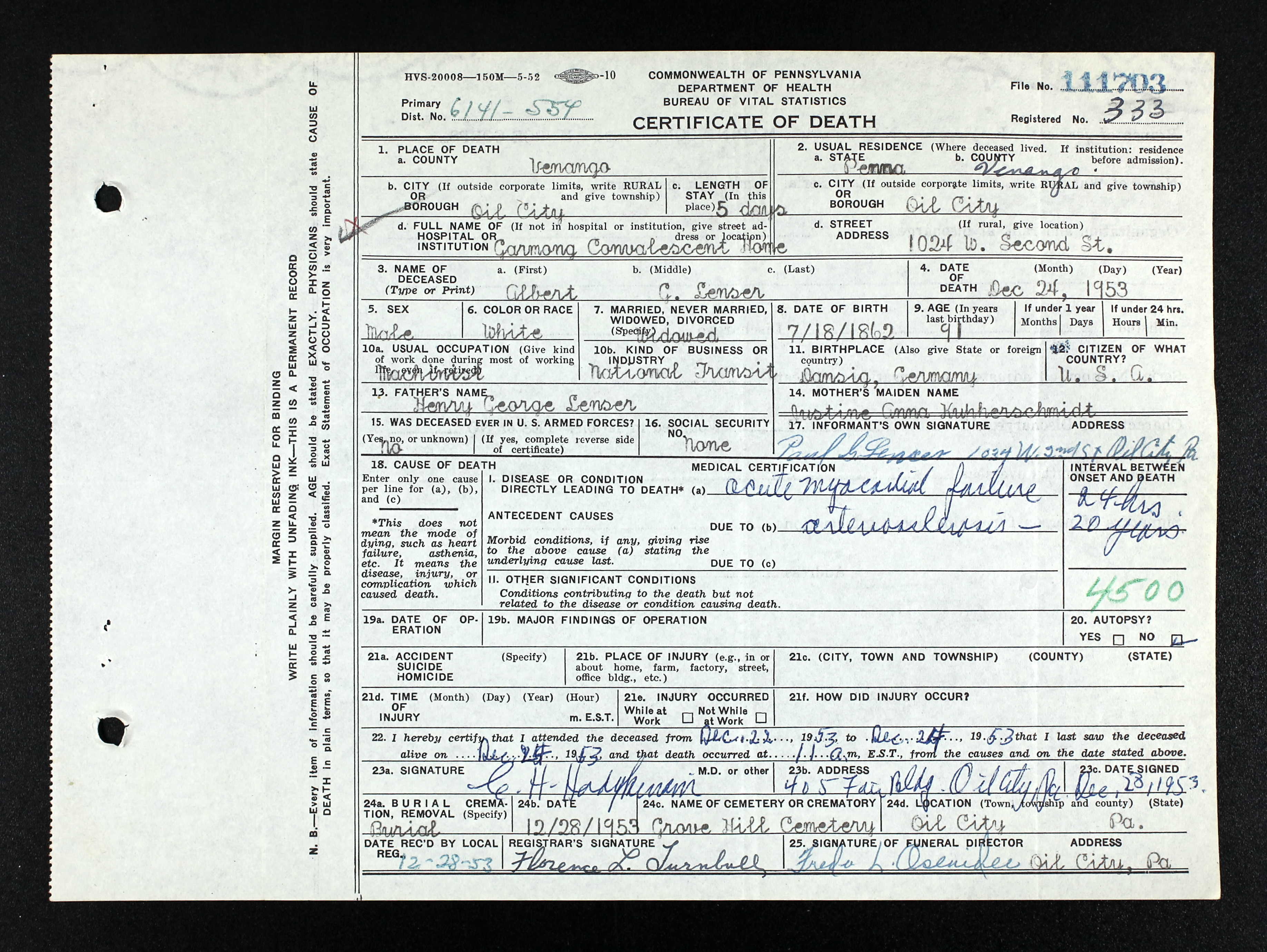 Albert G. Lenser - Pennsylvania, Death Certificates, 1906-1963