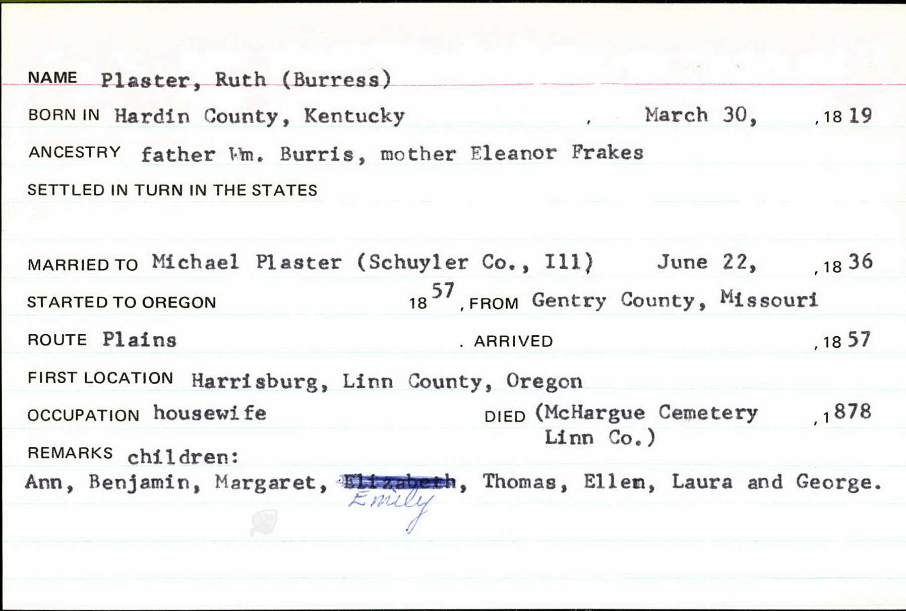 This index was compiled by staff of the Oregon Historical Society, from approximately 1900 to 1930. The data came primarily from questionnaires filled out by pioneers or their family members. All the information is contained on the cards – they do not refer to any other sources.
