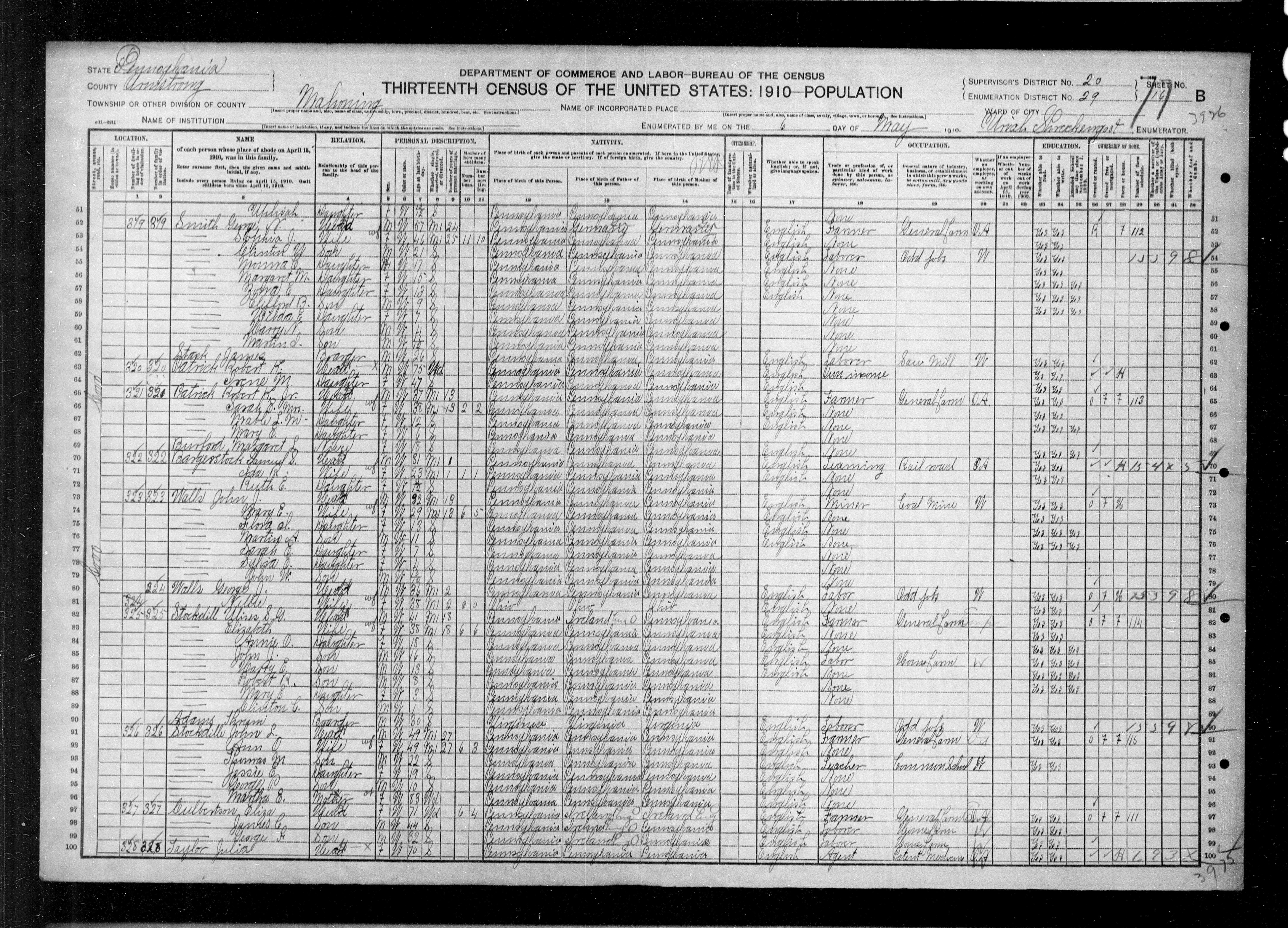 "United States Census, 1910," database with images, FamilySearch ( https://familysearch.org/ark:/61903/1:1:MGHJ-N1D : 20 October 2015), Julia Taylor, Mahoning, Armstrong, Pennsylvania, United States; citing enumeration district (ED) ED 29, sheet 17B, NARA microfilm publication T624 (Washington, D.C.: National Archives and Records Administration, n.d.); FHL microfilm 1,375,322.
