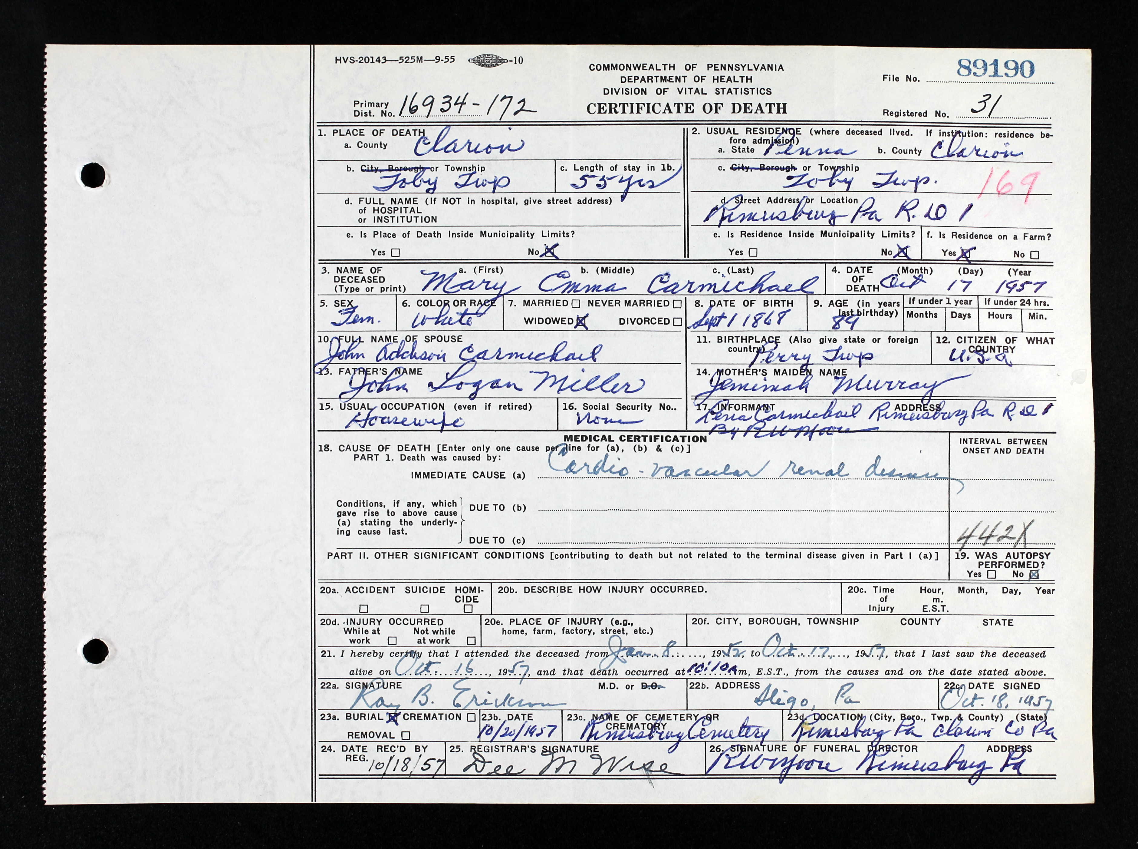 John Logan Miller & Jemimah Murray's Daughter's Death Record - Pennsylvania, Death Certificates, 1906-1963