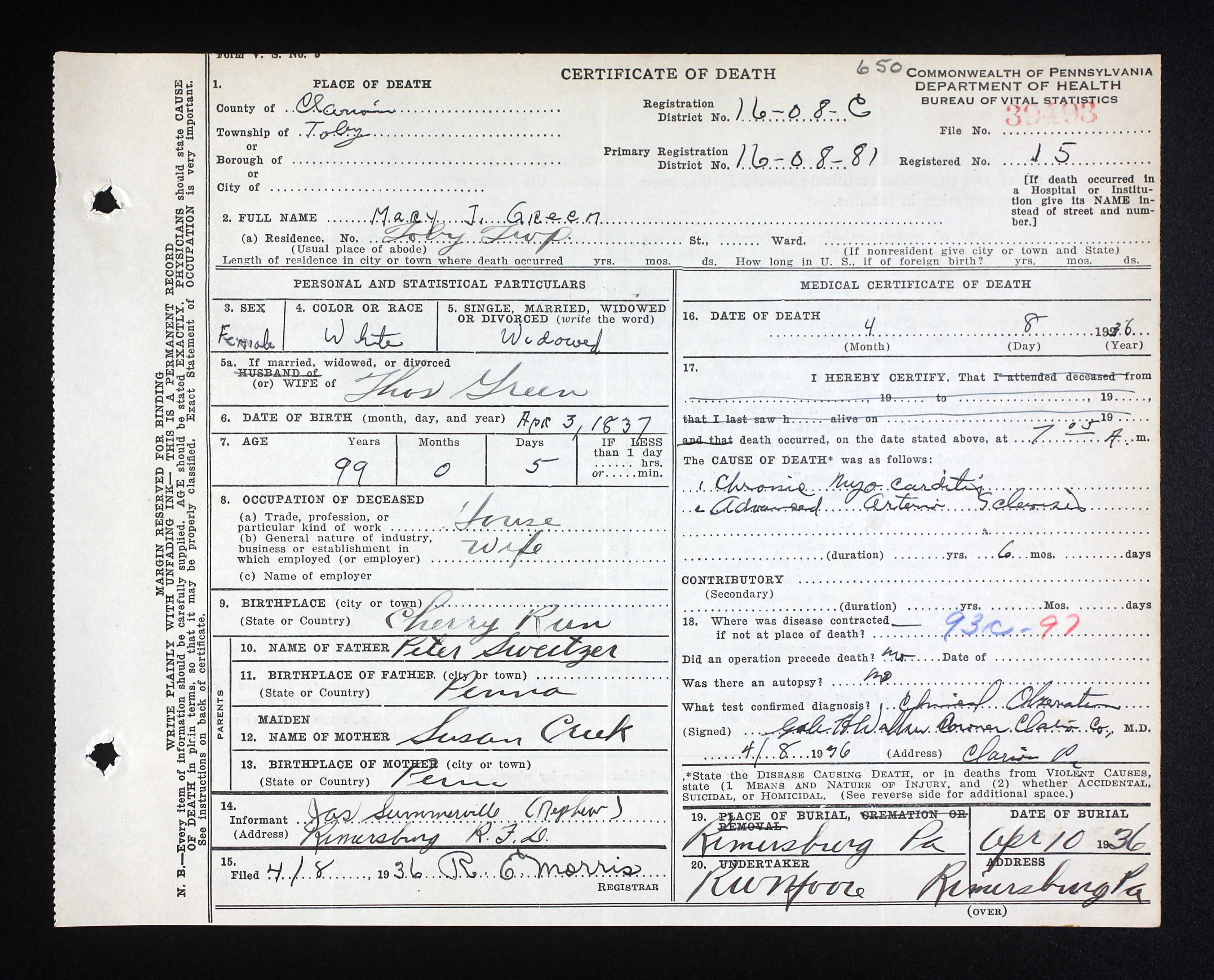 Mary Jane Switzer - Pennsylvania, Death Certificates, 1906-1963