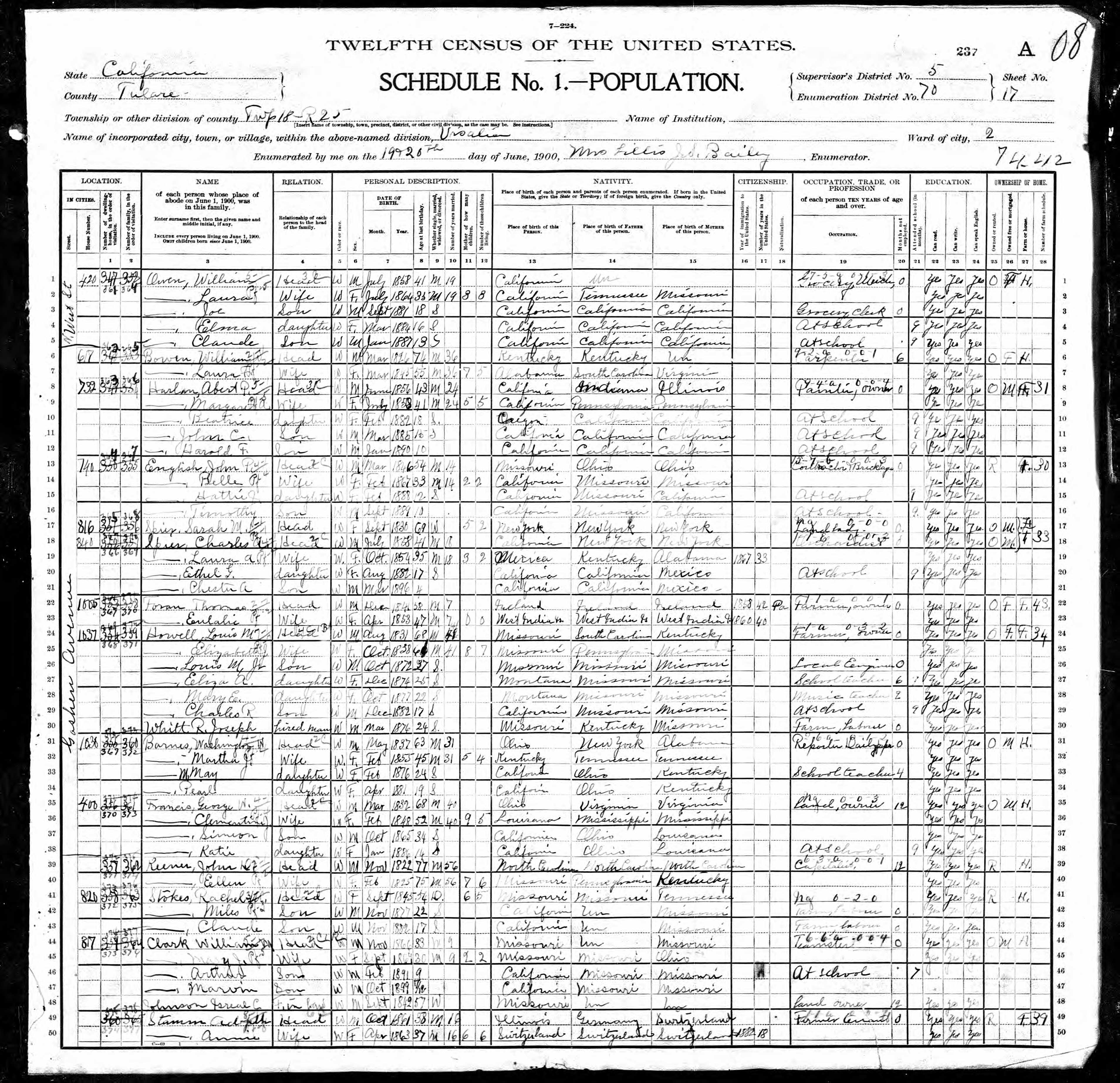 Year: 1900; Census Place: Visalia, Tulare, California; Roll: 115; Page: 17A; Enumeration District: 0070; FHL microfilm: 1240115