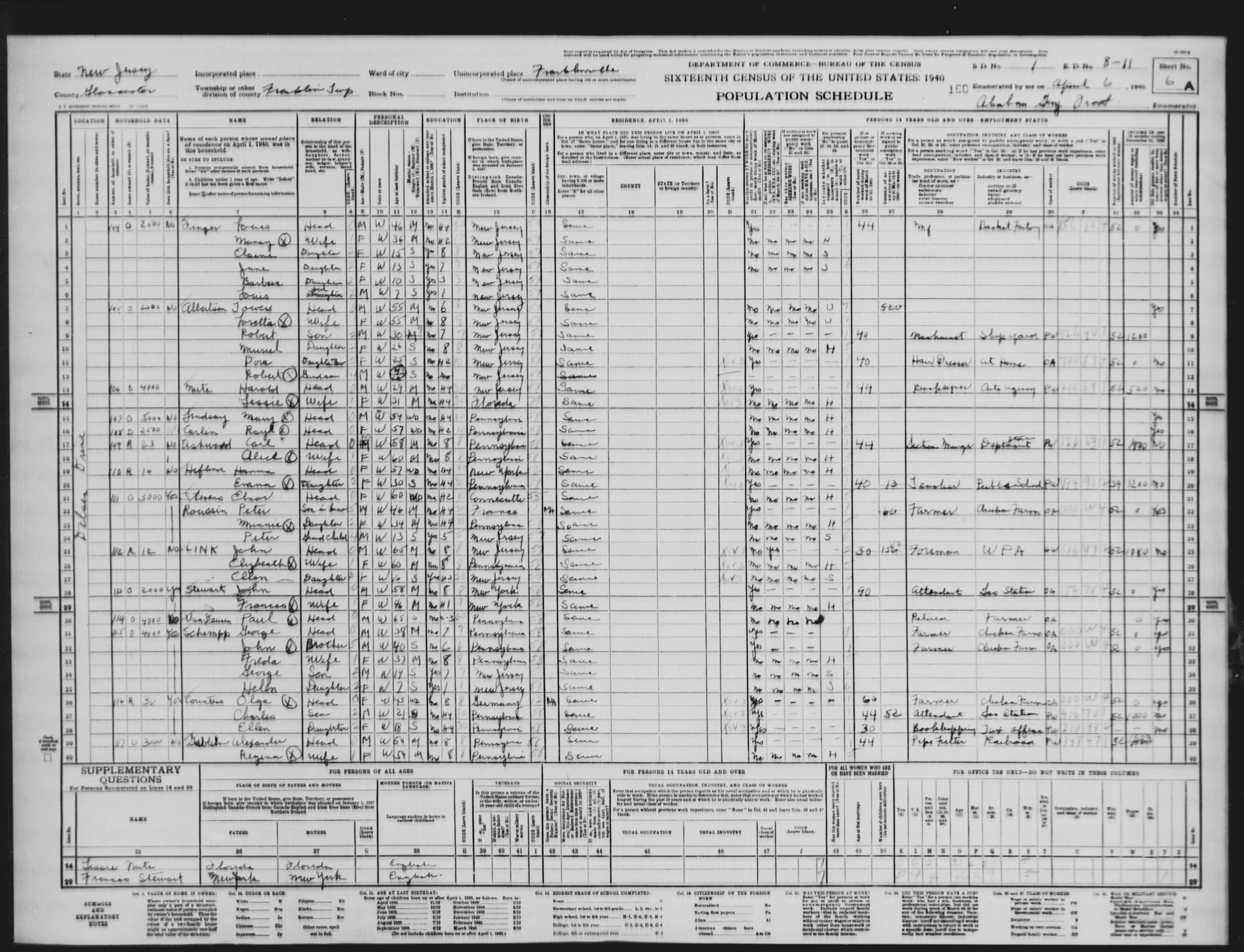 "United States Census, 1940," database with images, FamilySearch ( https://familysearch.org/ark:/61903/1:1:K4RH-M3B : accessed 18 December 2016), Paul Van Deusen, Franklin Township, Gloucester, New Jersey, United States; citing enumeration district (ED) 8-11, sheet 6A, line 30, family 114, Sixteenth Census of the United States, 1940, NARA digital publication T627. Records of the Bureau of the Census, 1790 - 2007, RG 29. Washington, D.C.: National Archives and Records Administration, 2012, roll 2342.
