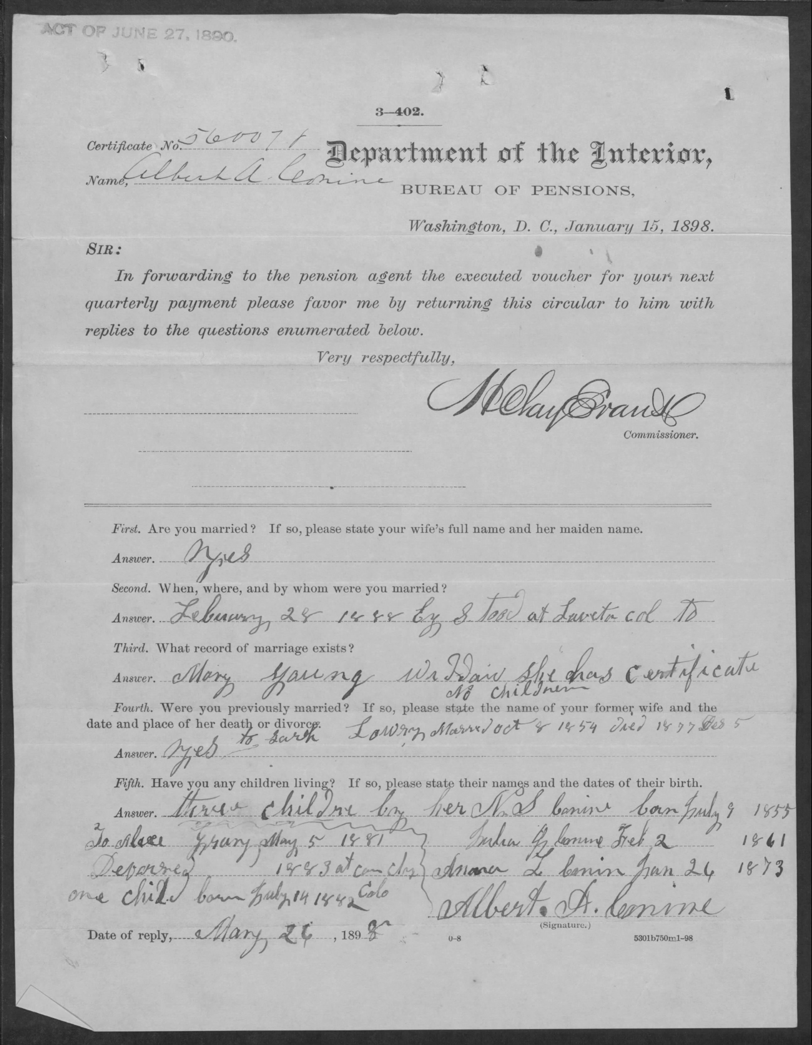 Albert A Conine - Department of the Interior Bureau of Pensions (Mentions previous marriage to Sarah)