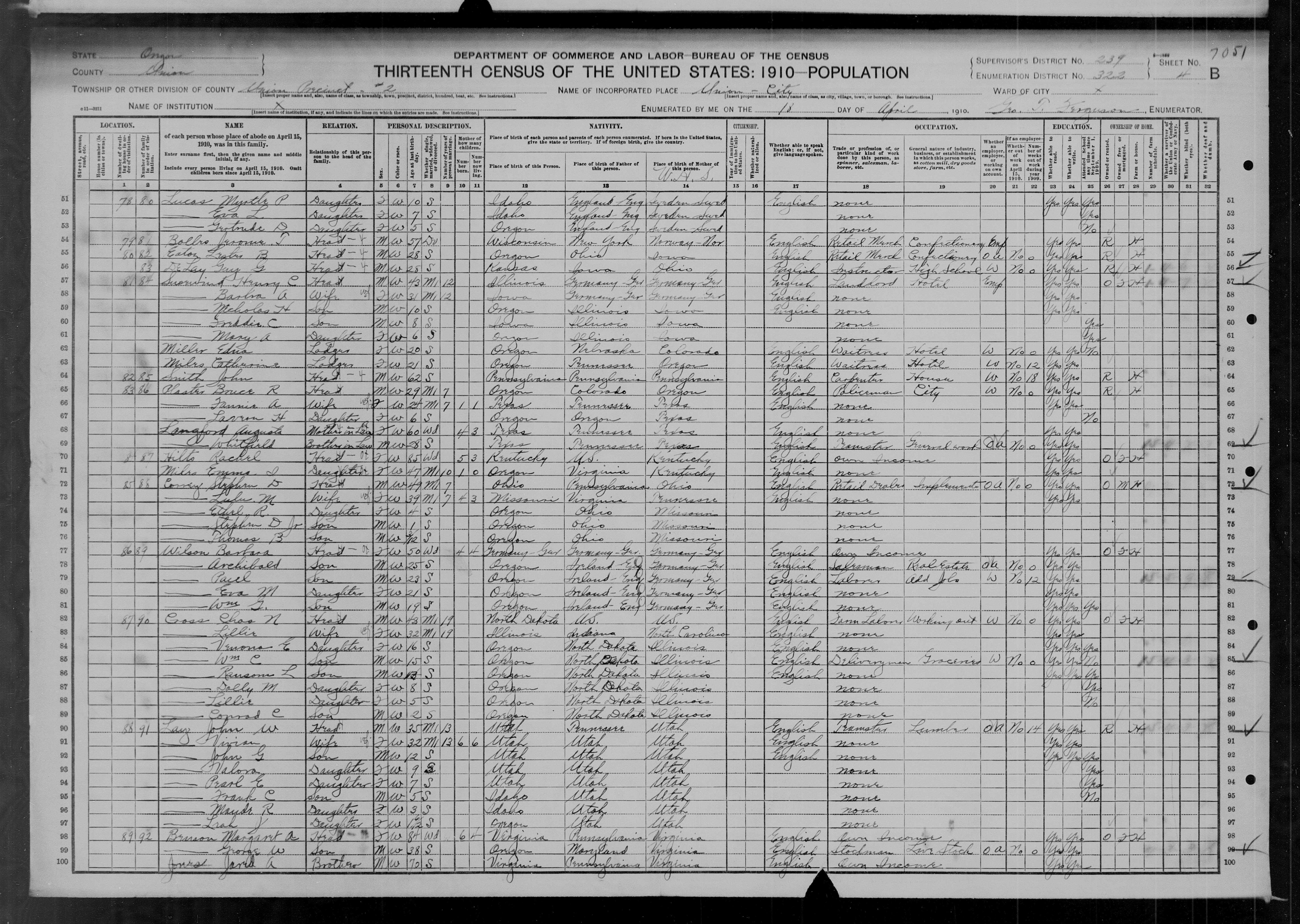 "United States Census, 1910," database with images, FamilySearch ( https://familysearch.org/ark:/61903/1:1:MLB9-M24 : accessed 16 March 2017), Bruce R Plaster, Union, Union, Oregon, United States; citing enumeration district (ED) ED 322, sheet 4B, family 86, NARA microfilm publication T624 (Washington D.C.: National Archives and Records Administration, 1982), roll 1290; FHL microfilm 1,375,303.