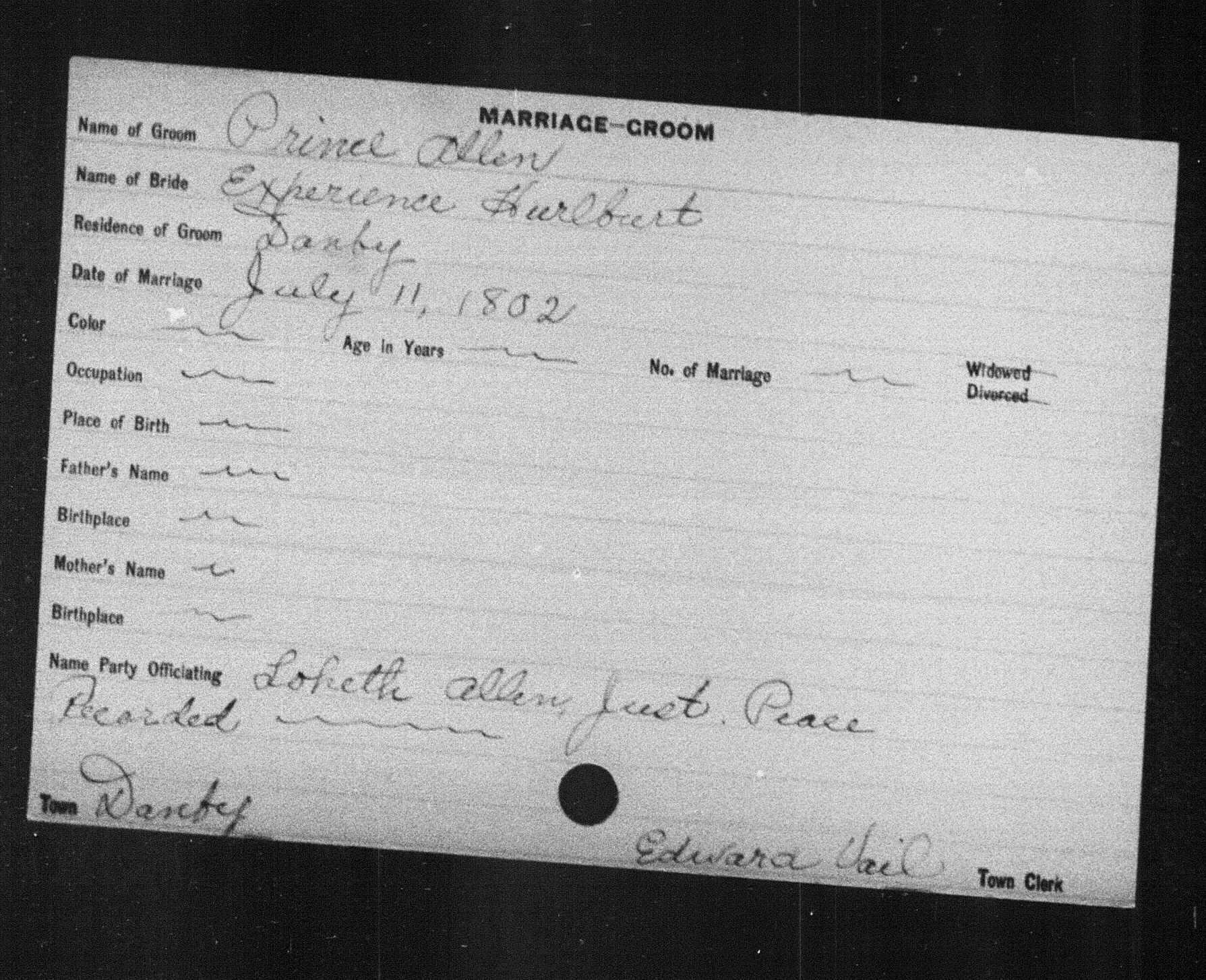 "Vermont Vital Records, 1760-1954," database with images, FamilySearch ( https://familysearch.org/ark:/61903/1:1:XFFL-YXK : 6 December 2014), Prince Allen and Experience Hurlburt, 11 Jul 1802, Marriage; State Capitol Building, Montpelier; FHL microfilm 27,459.