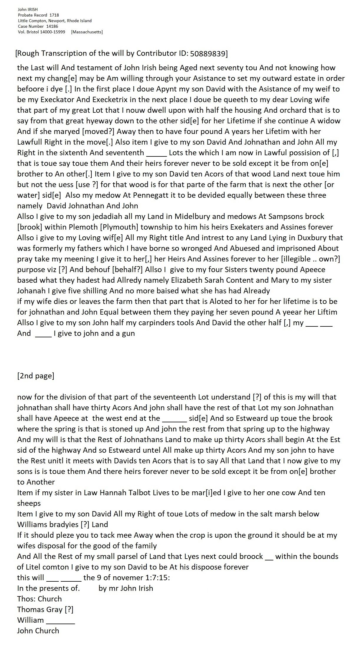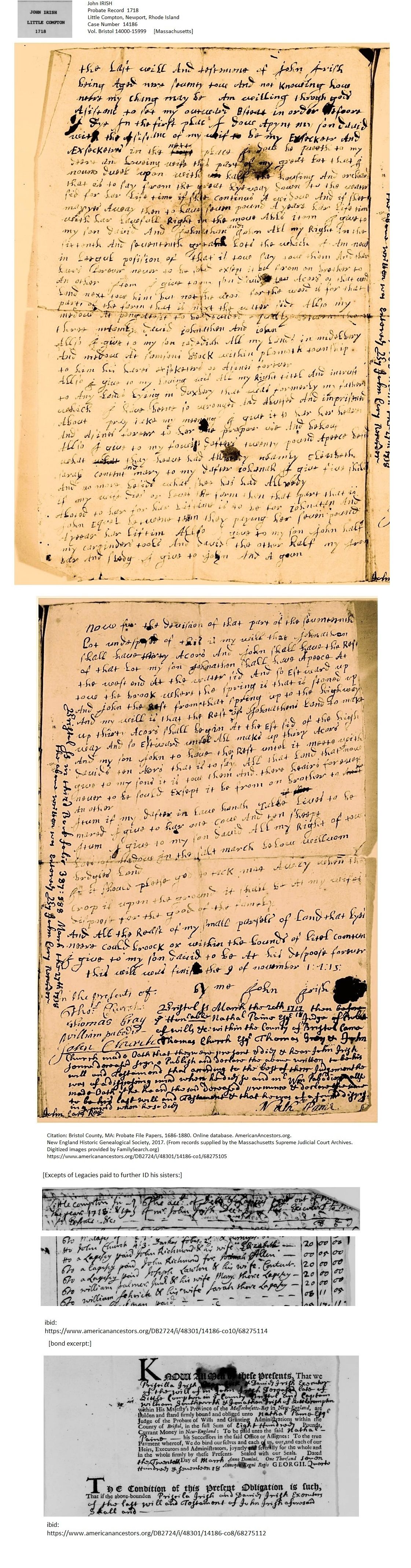 Note: I know, based on the old calendar and the date on the headstone, that John died in 1717. However, most of the probated records show the dual date 1717/8 (Will dated 9 Nov 1715; Inventory taken 25 Feb 1717/8; Proved 20 Mar 1717/8; Recorded 27 Mar 1718). I think is would be helpful to researchers to have a comment addressing this in his bio. In addition, it would be greatly appreciated if you would add the following to his bio, too; Married (2) Priscilla [Southworth] Talbot, widow of Samuel Talbot, on 1 May 1708 in Little Compton, Newport County, RI. Thank you, in advance, for consideration of my request. Contributor: Linne/Velcro (47336803)∼JOHN, 2nd known child of John & Elizabeth Irish, was born say 1647. He married (1) by about 1672 Elizabeth _____ (said to be Savory). He married (2) 1 May 1708 Priscilla (Southworth) Talbot, daughter of Edward Southworth and widow of Samuel Talbot.