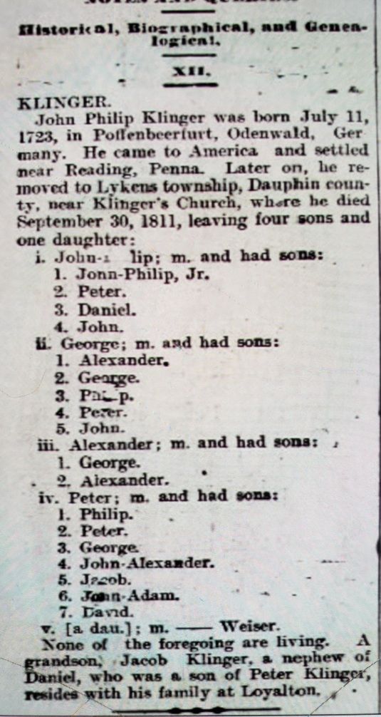 Johan Phillip Klinger, son of Johannes and Agatha Heist Klinger, was born in the village of Pfaffen-Beerfurth, in the Odenwald region, state of Hesse, German in 1723.